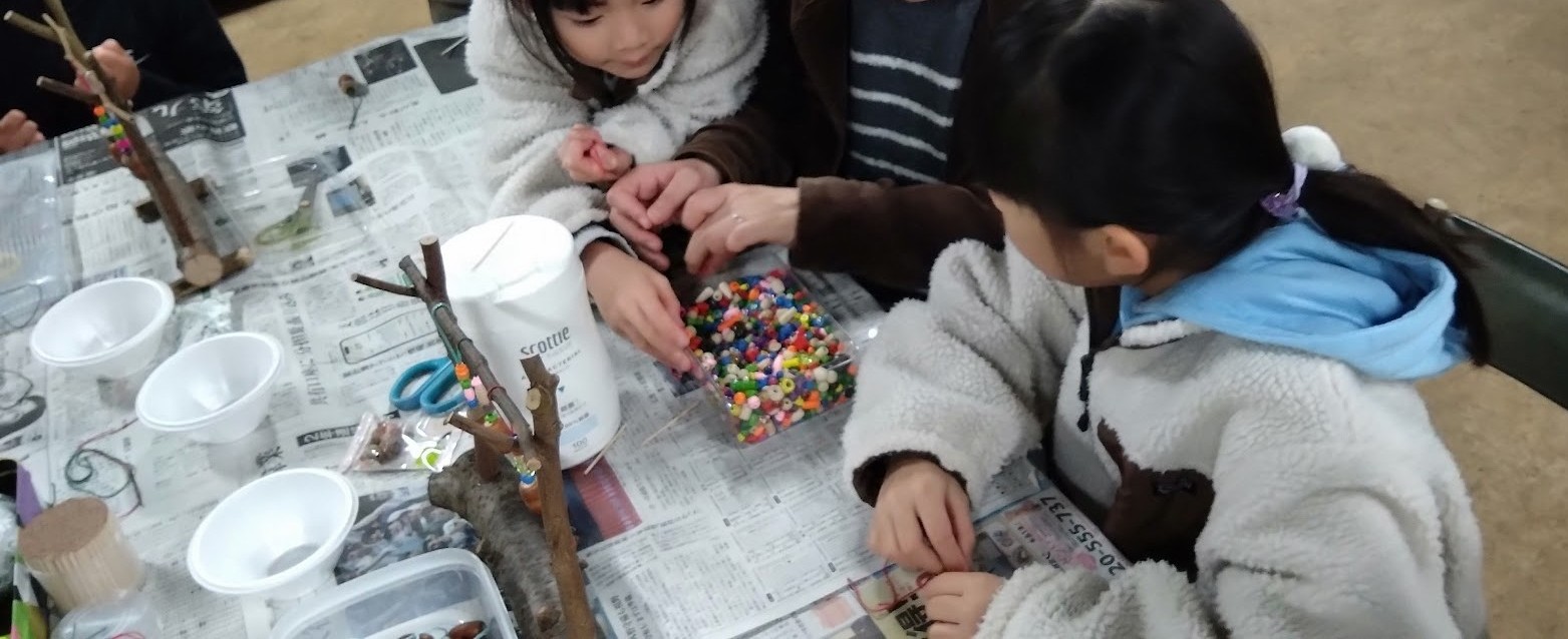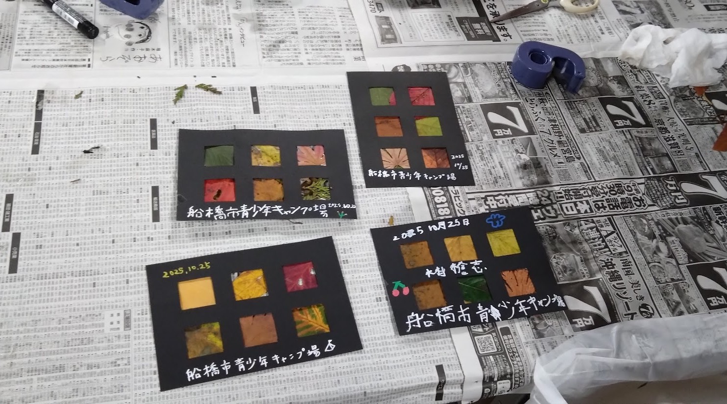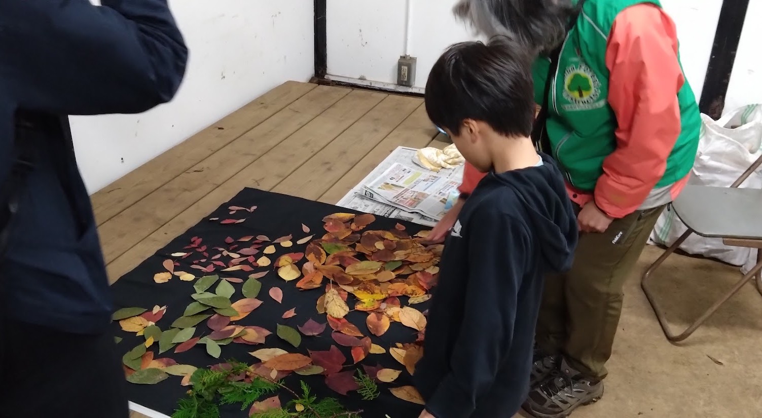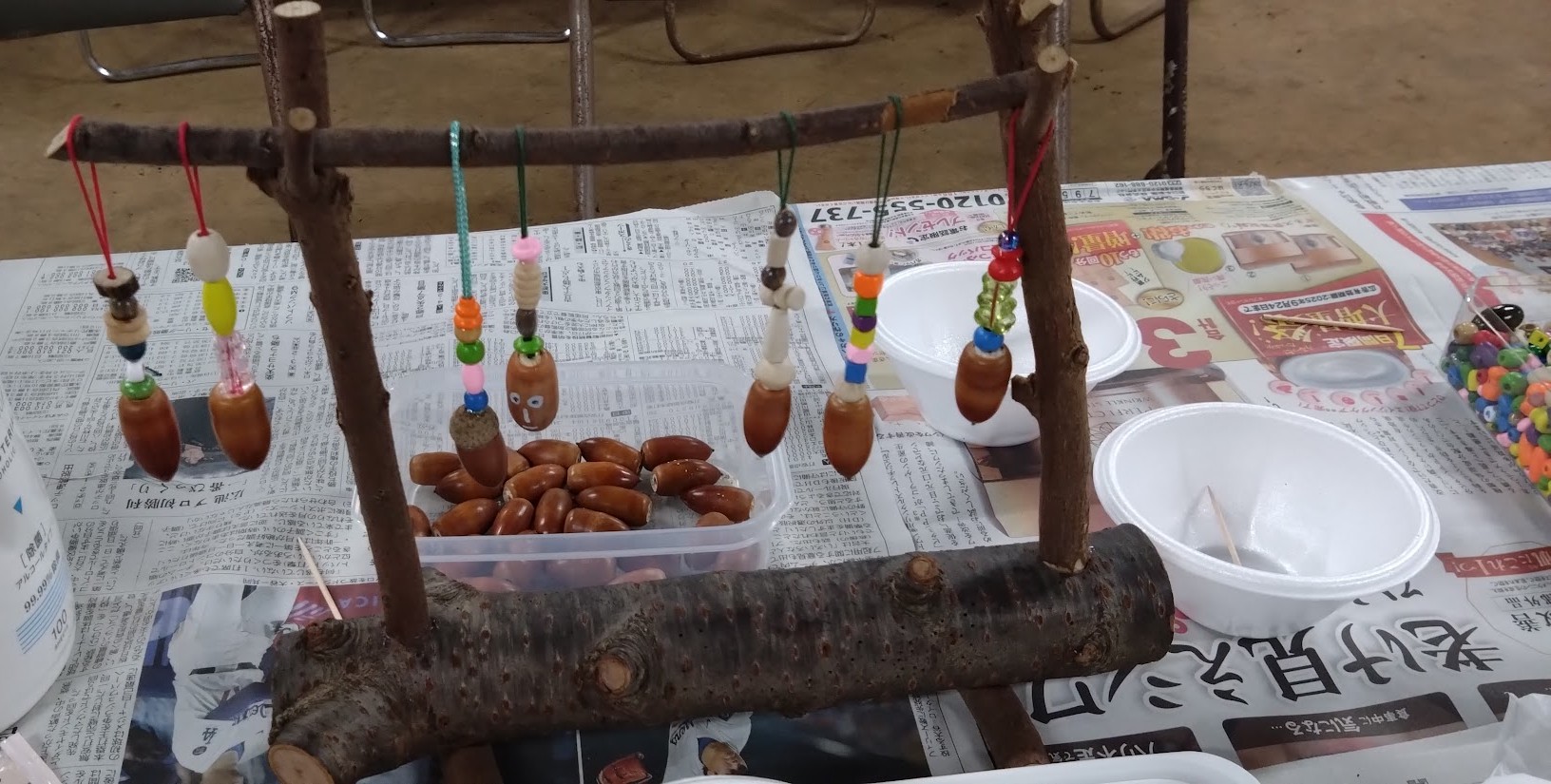 船橋青少年キャンプ場でのネイチャークラフトです。森は深く、入口から白線をたどって会場にたどり着きます。森で拾った落ち葉やどんぐり、どんぐりの殻斗で3つのクラフトを作りました。