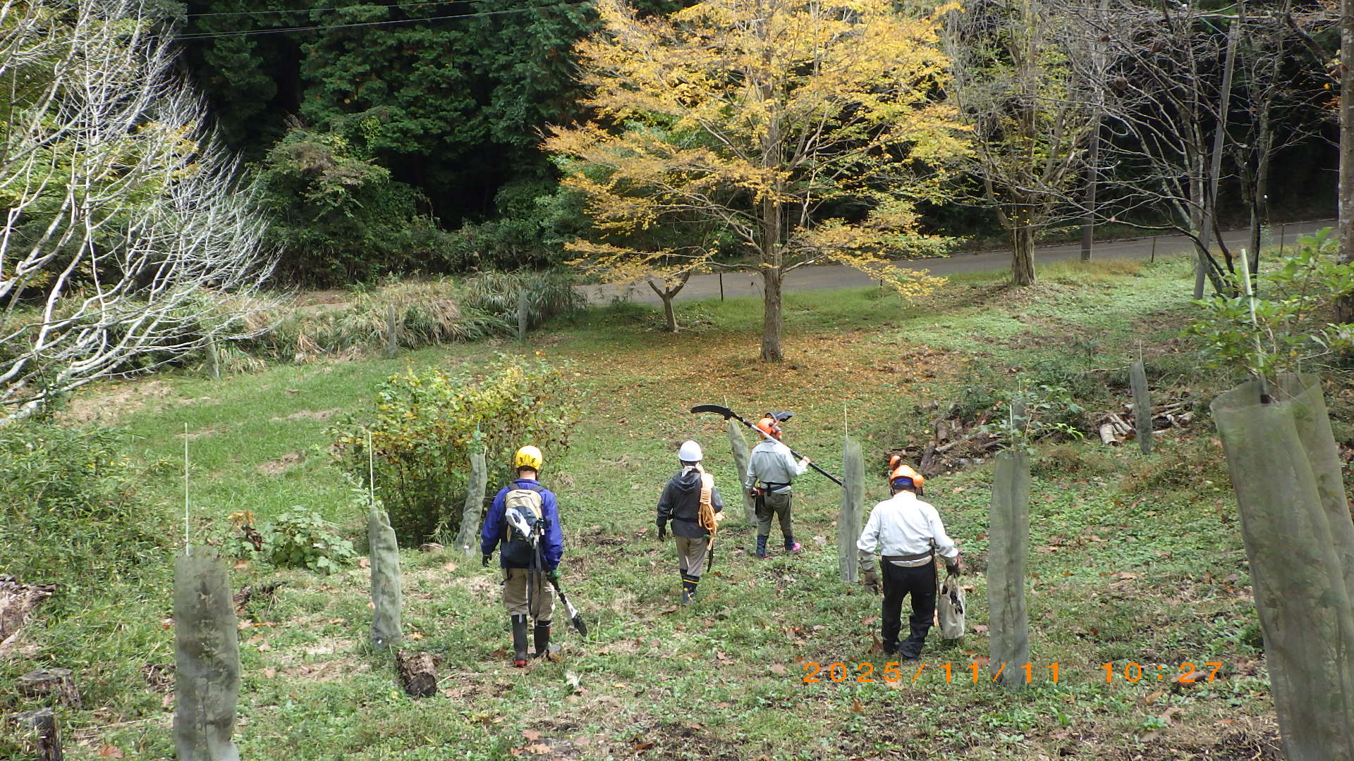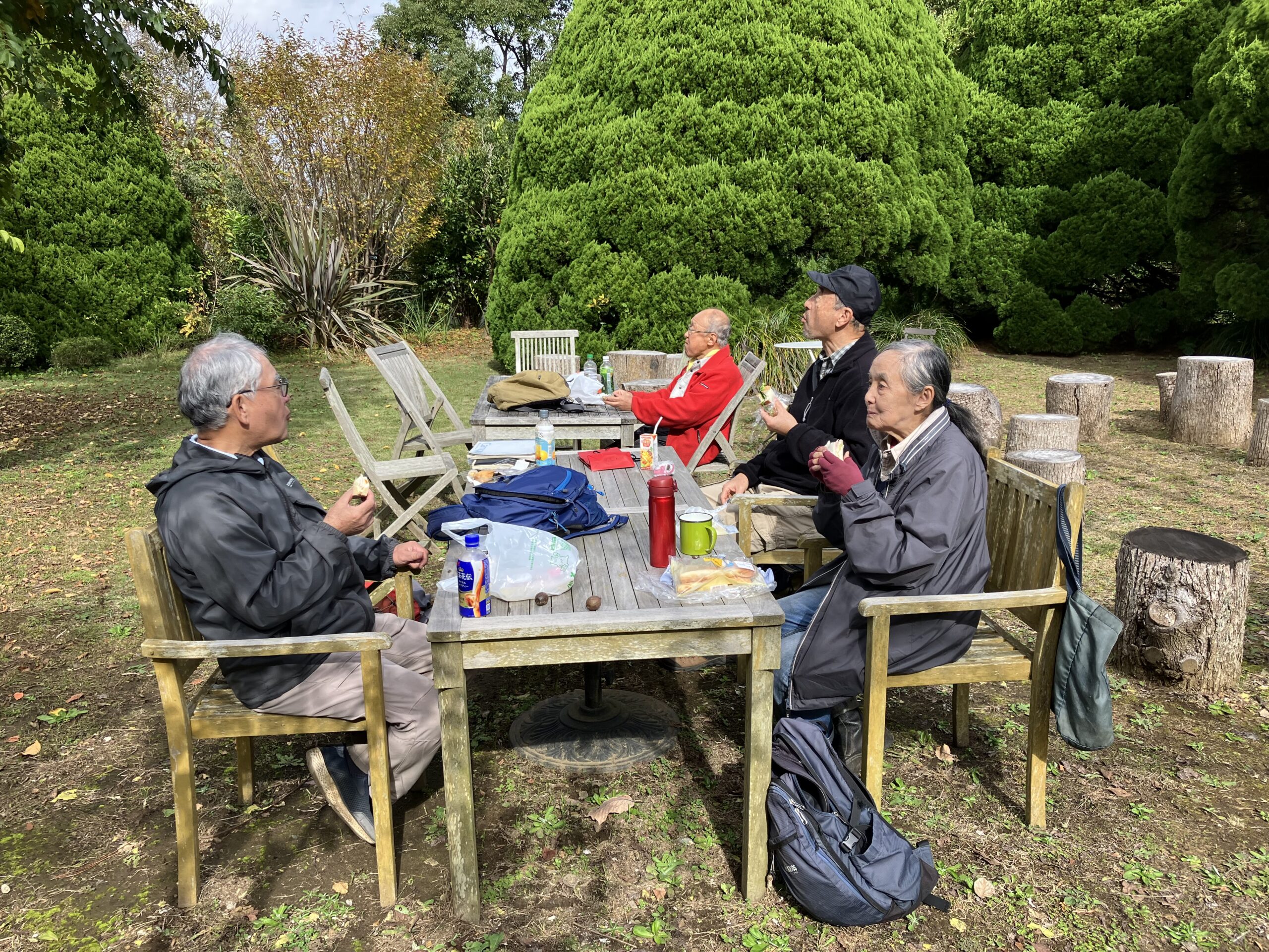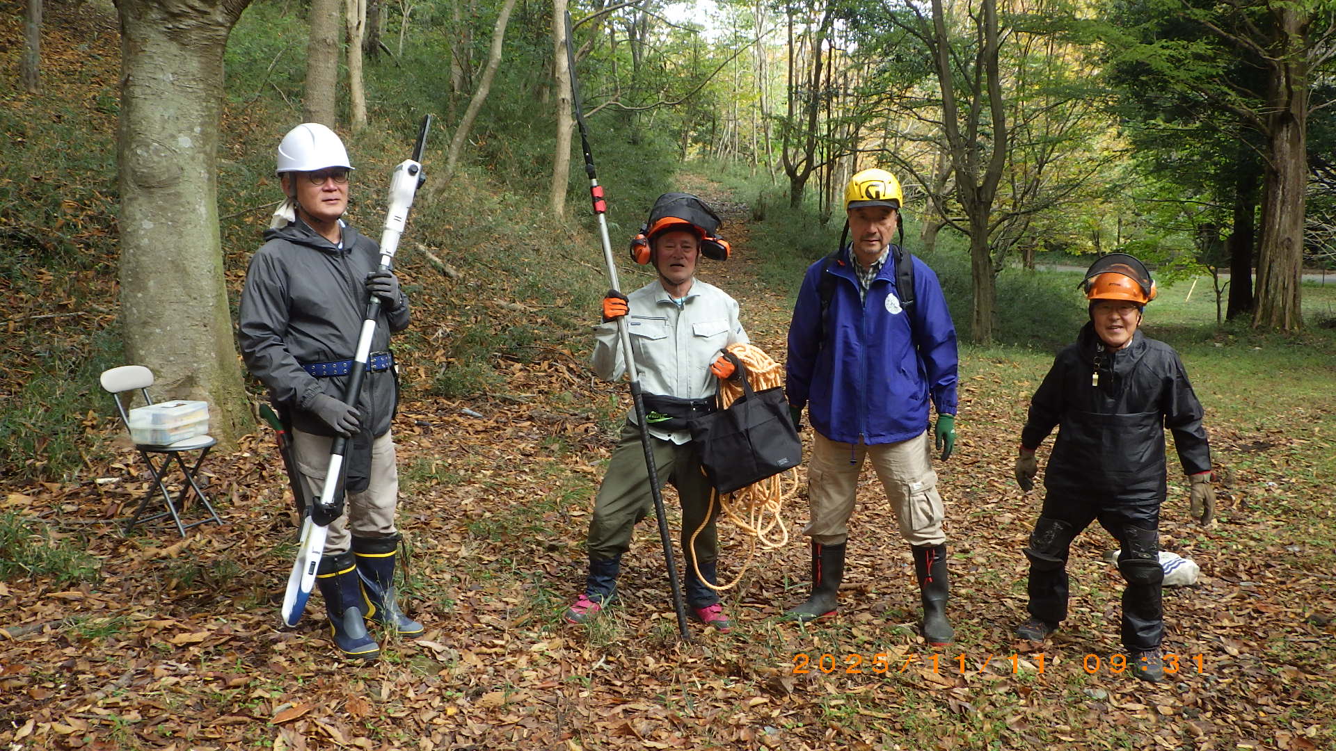 内山緑地のガーディナーハウス付近で昼食をとりその後打合せを実施した。枯れ枝処理用の高枝鋸や高枝チェーンソーについては、使用頻度が少ないのでFICでの購入はせず他団体より借用でのみ活用とする。当分の間借用予定である。次回の活動日も遊々の森倉庫前斜面の下草刈りを実施しケヤキの枯れ木も多いので枯れ枝処理も実施予定とします。