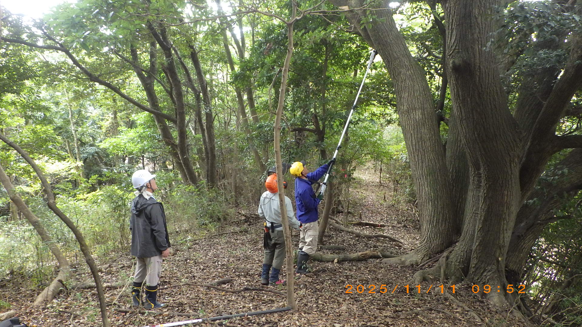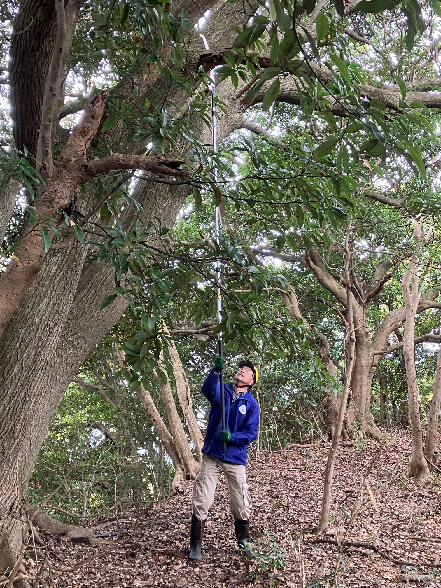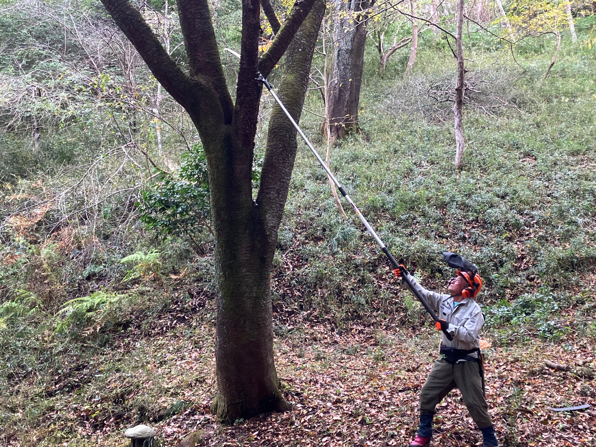 まずは、10月に確認した緊急処理の必要があるFICの森山頂部付近のスダジイの大木の枯れ枝を、高枝鋸・高枝チェーンソーを活用した作業であり、高さ5mあり高枝鋸は大変有効で使い勝手が良いが、太い枝(20cm以上)はポールを引く手がパンパンとなるので何人かで交代しながら使用する必要があった。また高枝チェーンソーは高さ4mで枝の直径が10cm程度までしか使用できなかった。これらを活用しスダジイの枯れ枝を何本か処理した。ほかにもカツラ広場の斜面のネコノチチの枯れ枝や倉庫付近のケヤキやヤマザクラの枯れ枝も何本も処理することができた。