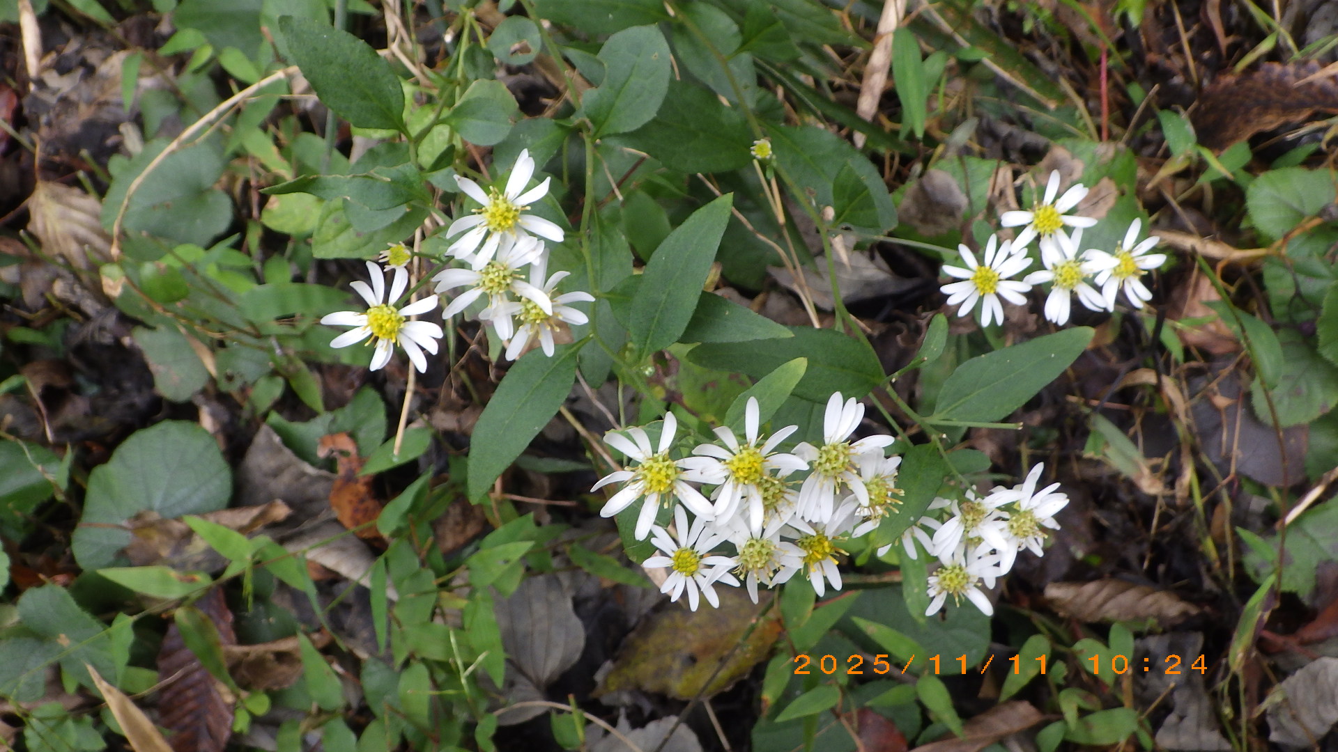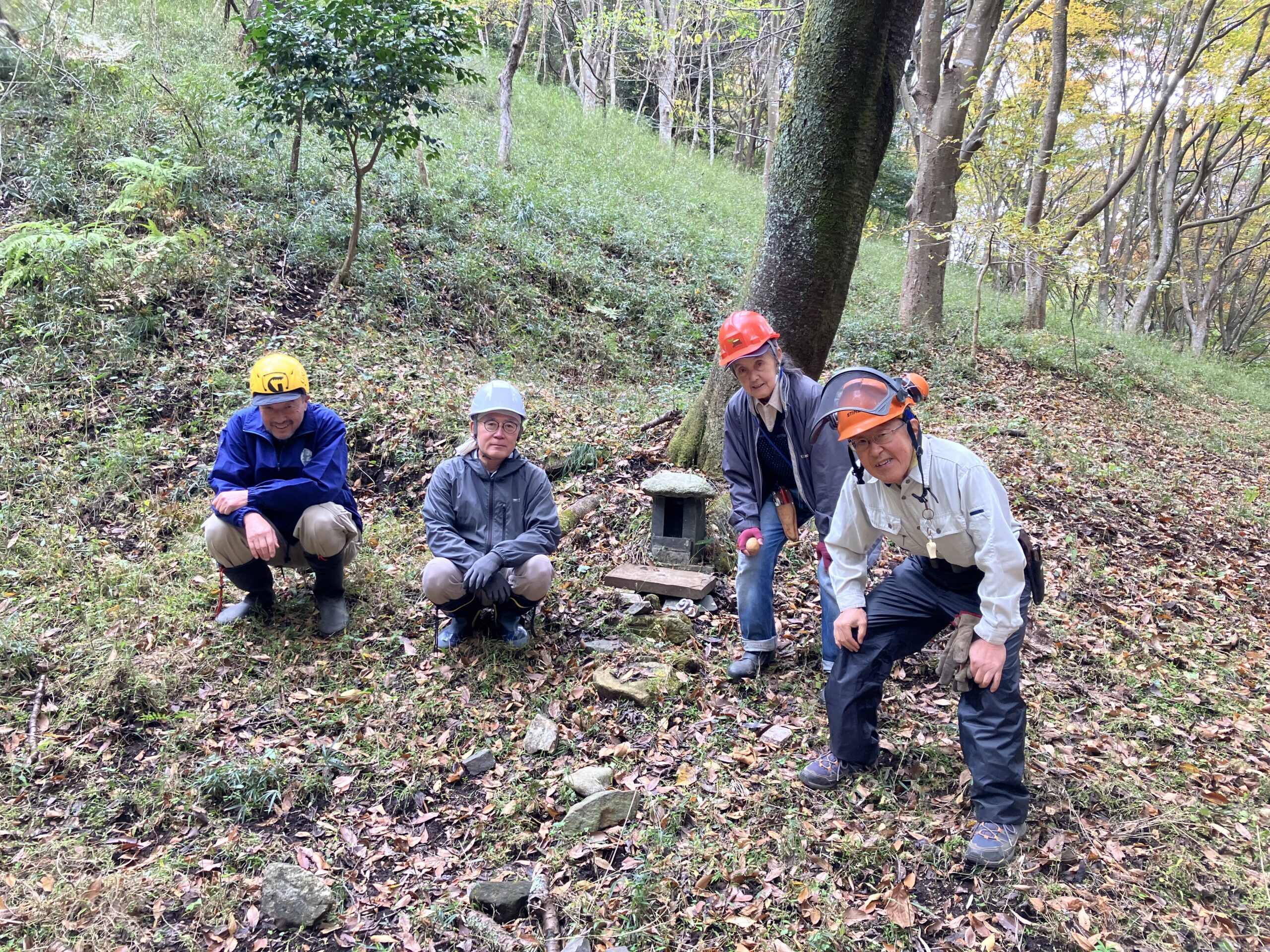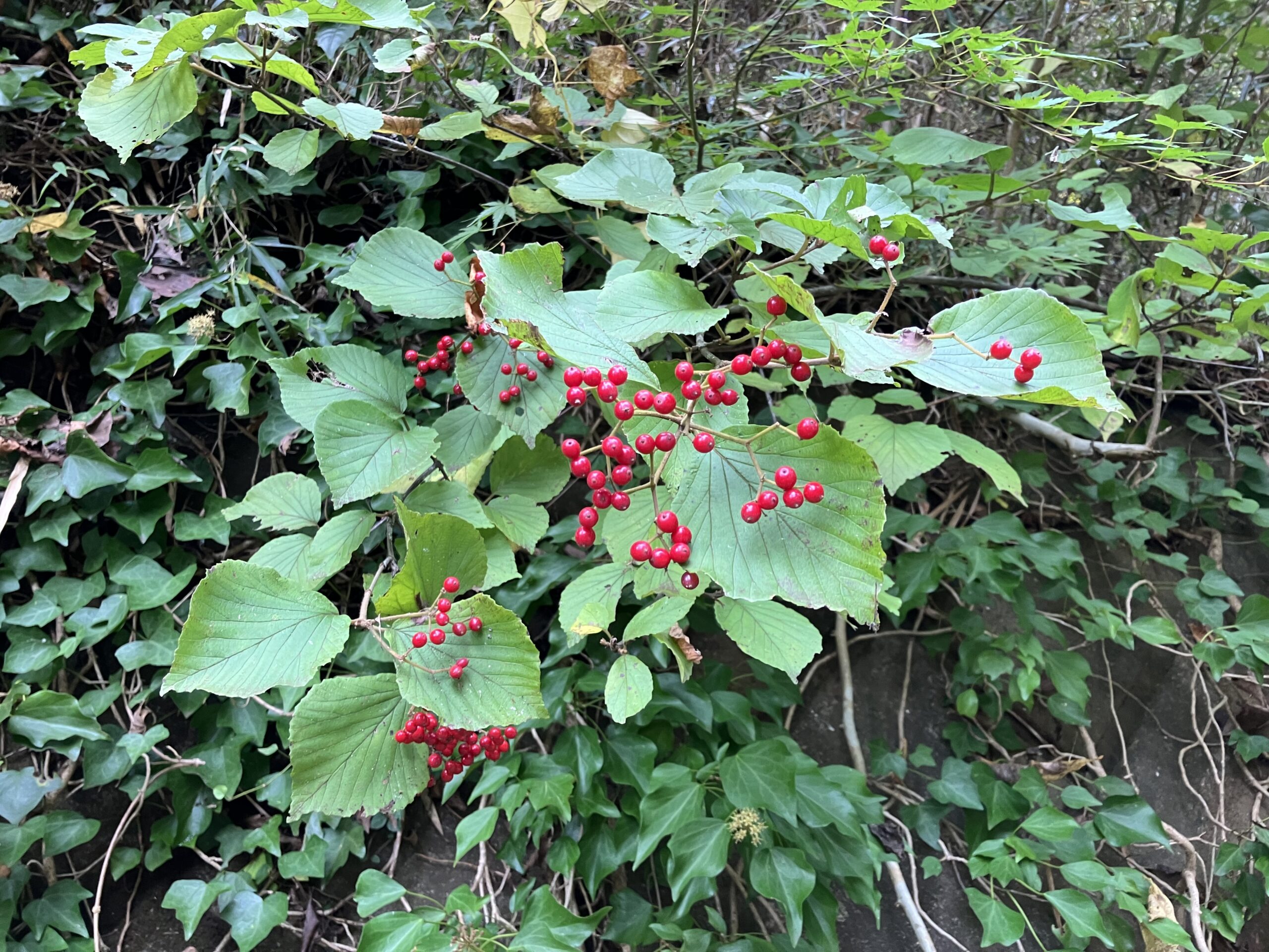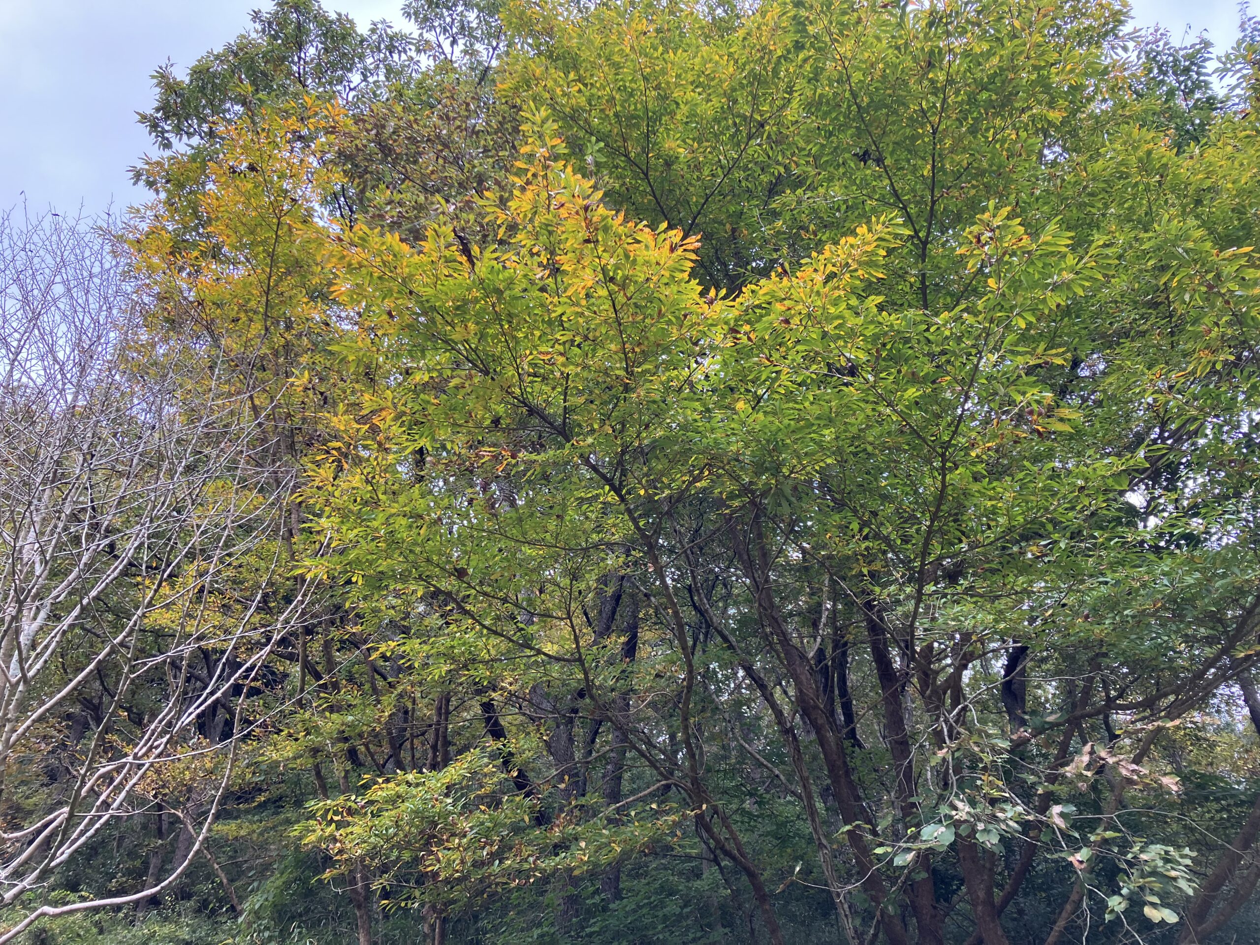 FICの森で秋を感じさせる植物等を多く観察することができた。シロヨメナ・青い花が目立つツクバトリカブト・タイアザミ・サンショウの赤い実・黄葉のメグスリノキ・落ち葉が香る黄葉のカツラ・赤い実のガマズミ・たわわと実るミツバアケビ・ネコノチチなどを観察。またFICの森と市道を挟んであるケンポナシの大木は、まだ美味しい太った果柄部の落下が少なく、甘みも来月頃が食べごろと思われた。作業や観察などすべて終了し、山の神付近で集合写真を撮りFICの森を引き上げた。