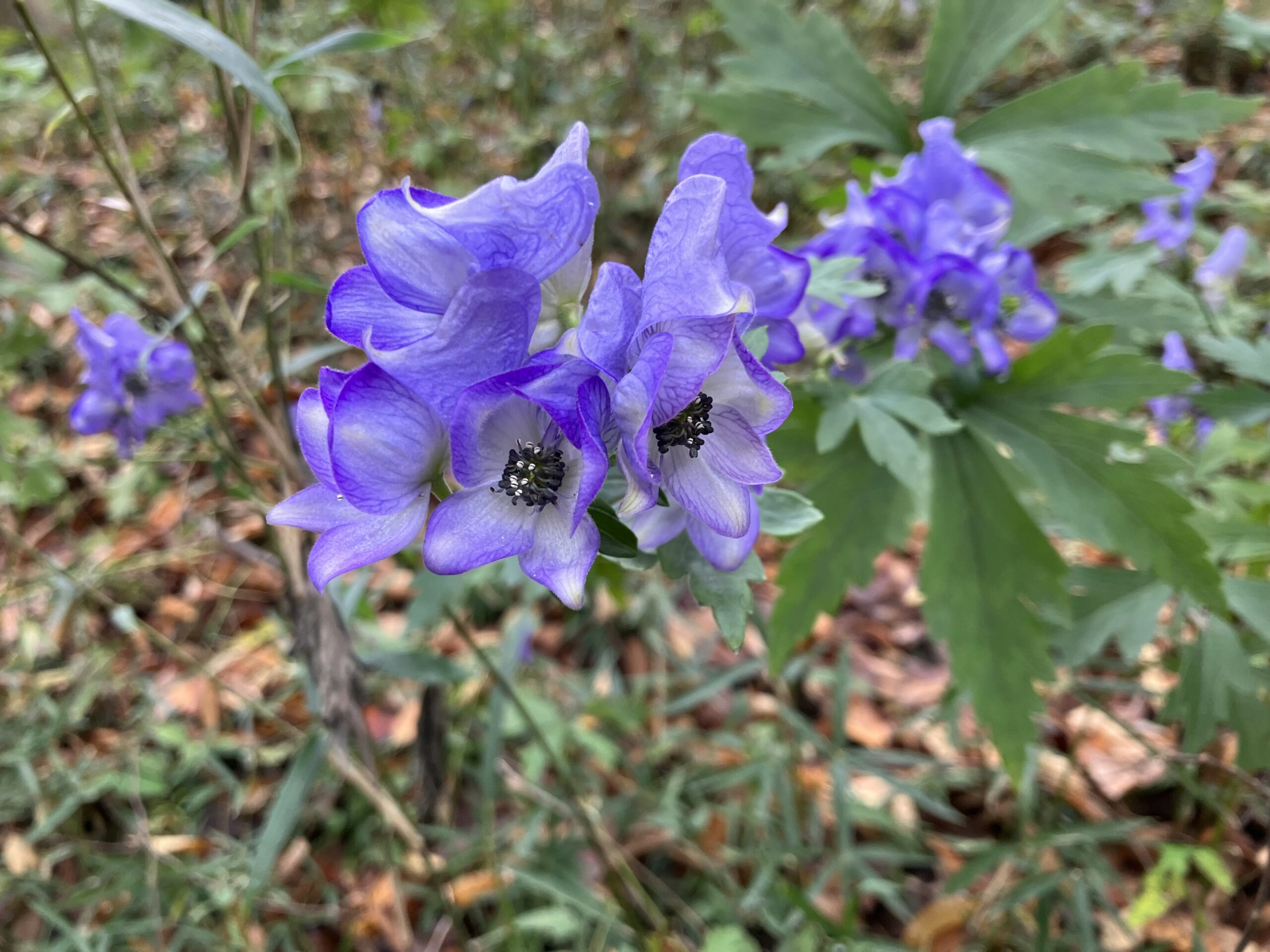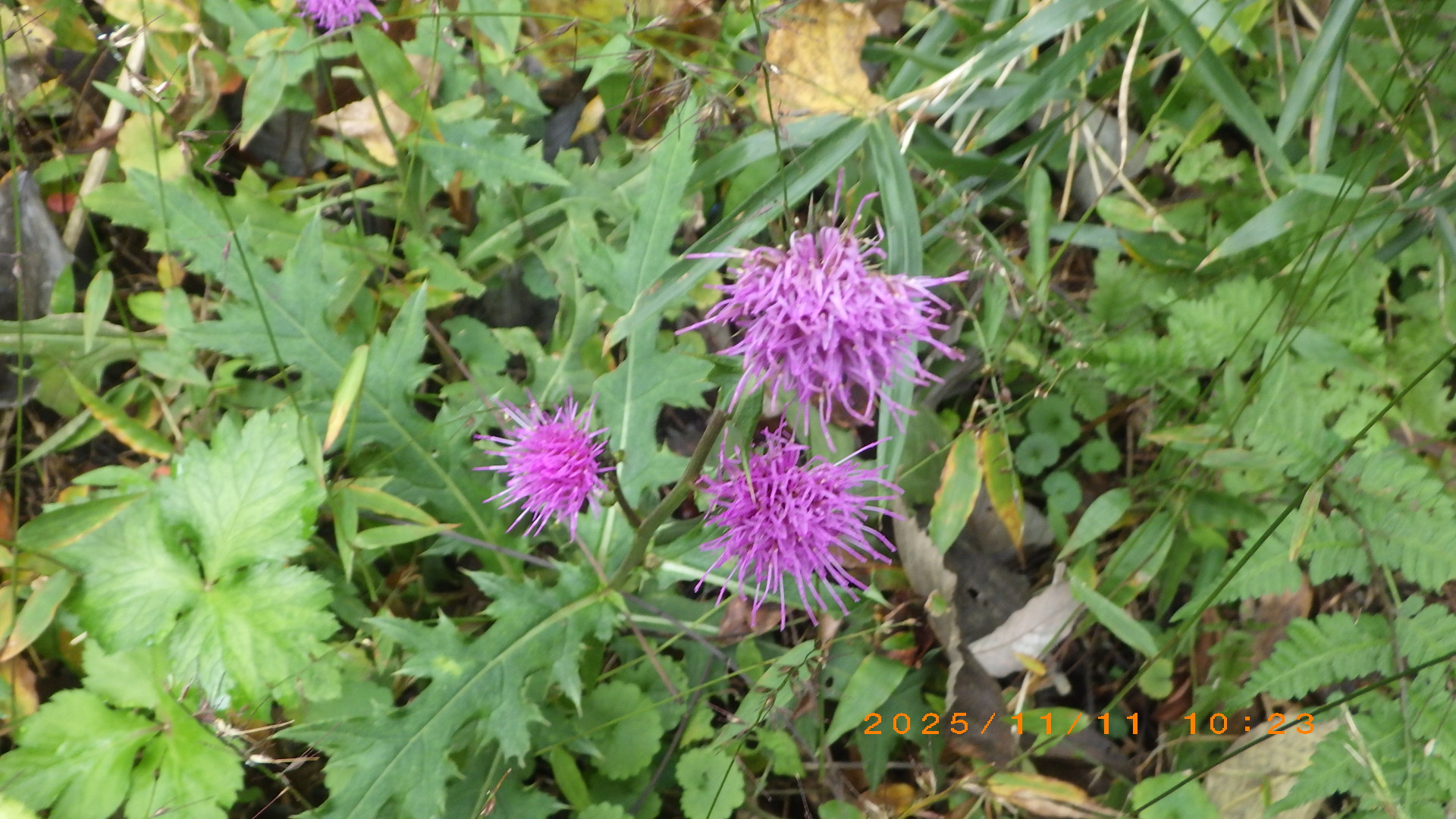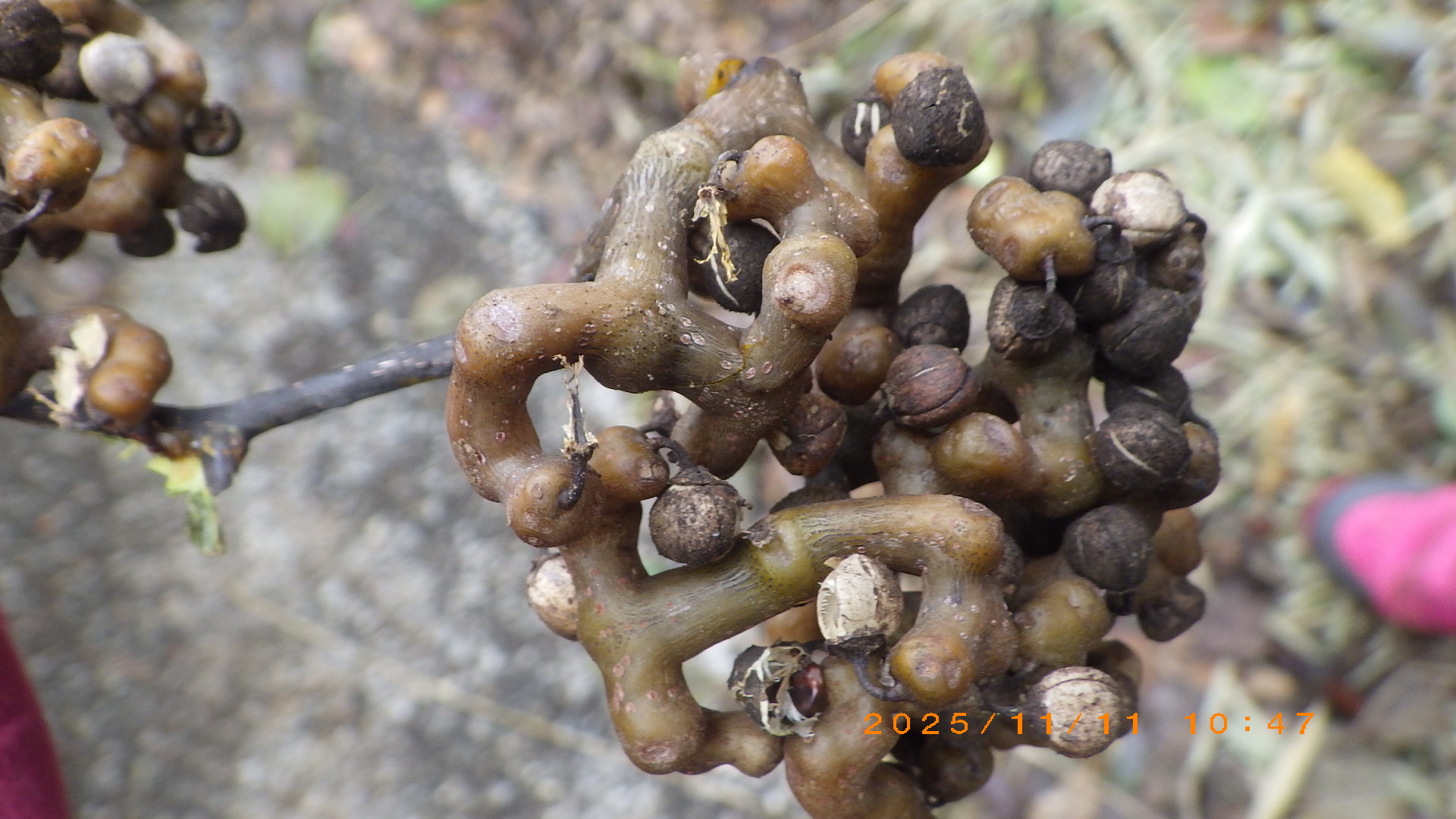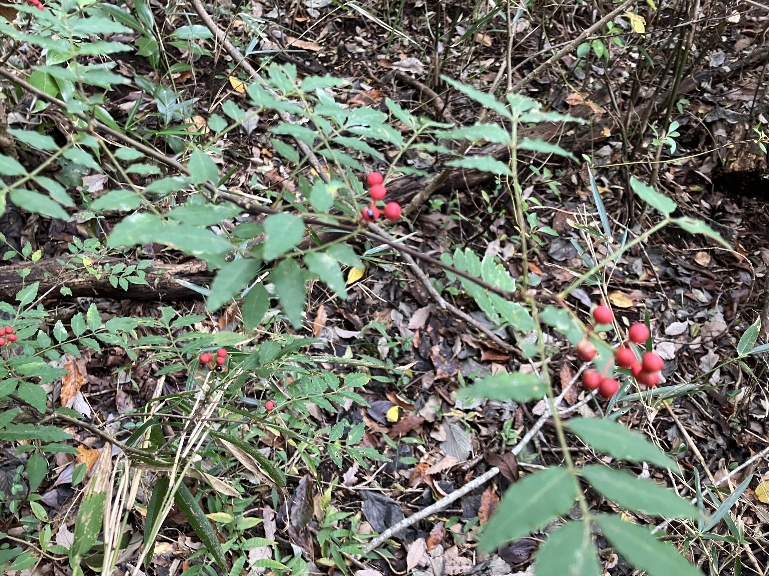 FICの森で秋を感じさせる植物等を多く観察することができた。シロヨメナ・青い花が目立つツクバトリカブト・タイアザミ・サンショウの赤い実・黄葉のメグスリノキ・落ち葉が香る黄葉のカツラ・赤い実のガマズミ・たわわと実るミツバアケビ・ネコノチチなどを観察。またFICの森と市道を挟んであるケンポナシの大木は、まだ美味しい太った果柄部の落下が少なく、甘みも来月頃が食べごろと思われた。作業や観察などすべて終了し、山の神付近で集合写真を撮りFICの森を引き上げた。