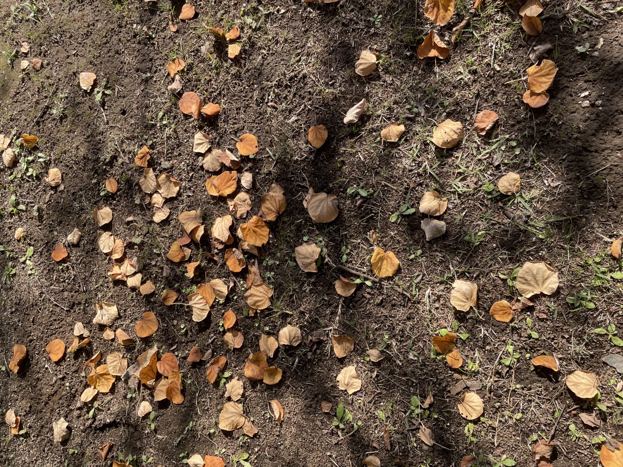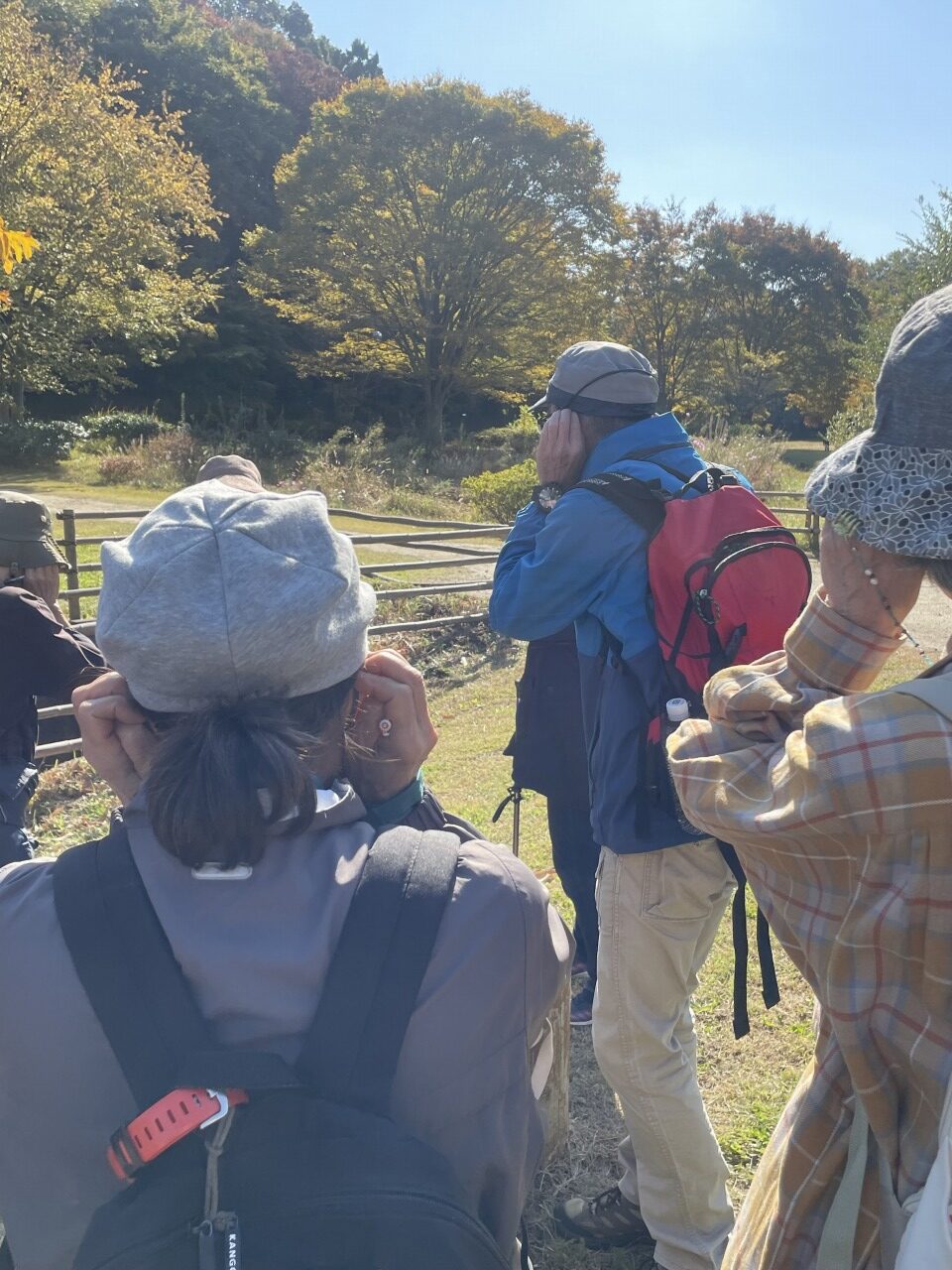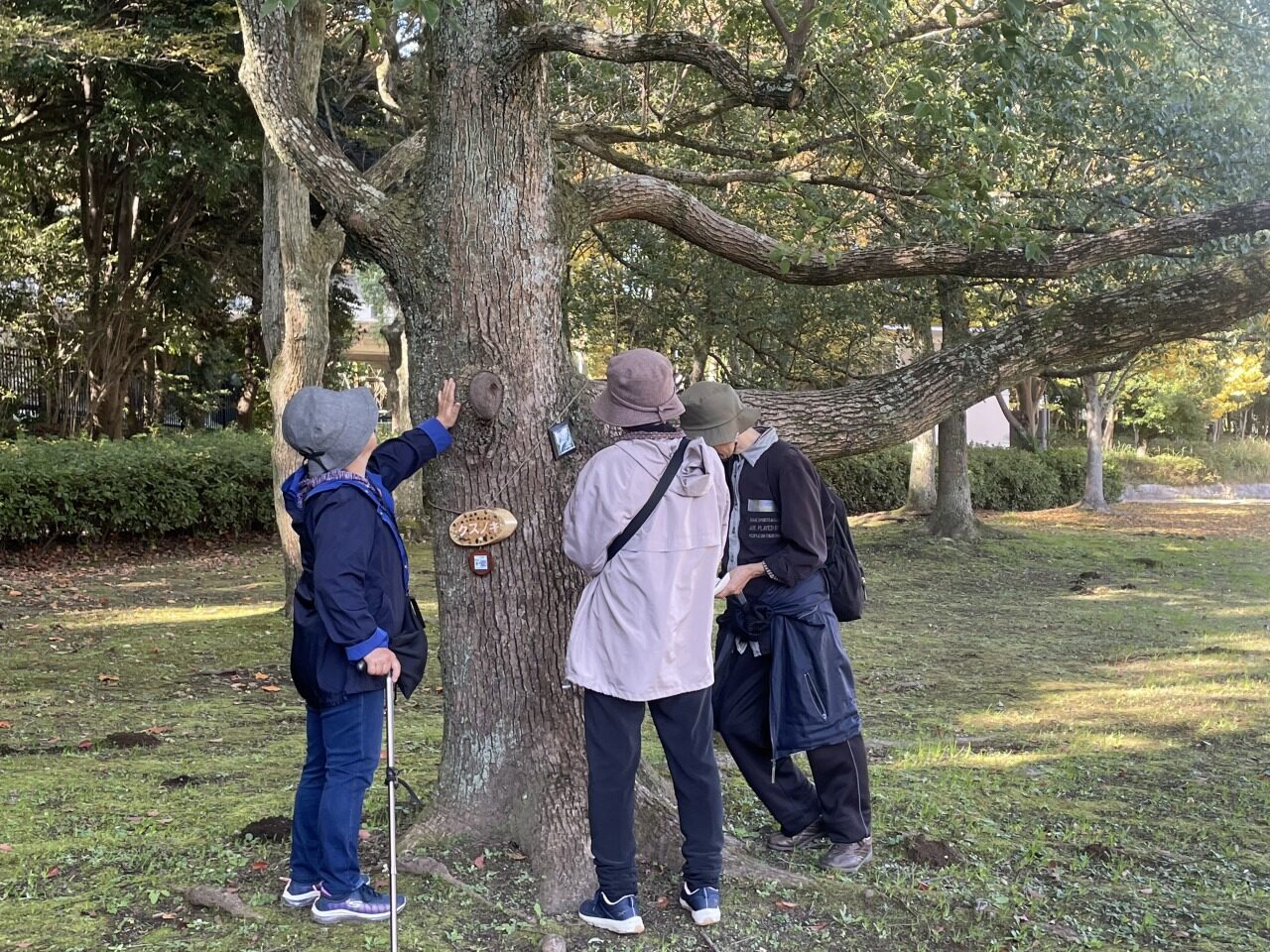 パークセンター前にて参加者の皆様に五感の活用による森林浴の効果につき簡単にレクチャーし、その後園内散策を始めました。足裏で地面の起伏の感触を感じてもらい、ちょうど開花時期を迎えたヒイラギの甘い花の香りを嗅ぎ、足元のチドメグサの葉の効能を説明しました。秋の七草エリアで遅咲きのキキョウの花を鑑賞し、ムクロジの果実を拾って触り、クズやネムノキの毛の生えた果実の手触りを楽しみます。イヌマキの生垣では雌株についた二色の果実を皆さんで味わいました。園内を流れる小川の畔で両手で耳を覆うと前方の音がはっきりと聞こえることを実演し皆さんにも体験してもらいました。園路沿いの紅葉を楽しみ、カツラの木の下で甘い香りの落葉の匂いを嗅いでもらいます。カラメル、綿あめなど皆様の感想も様々です。その後ナツツバキ(つるつるの樹皮:ひんやり)とクスノキ(コルク層の樹皮:暖かい)を交互に触ってもらい感想をお聞きしました。クスノキはつんとくる葉の匂いも嗅いでもらい樟脳の原料であることを解説しました。