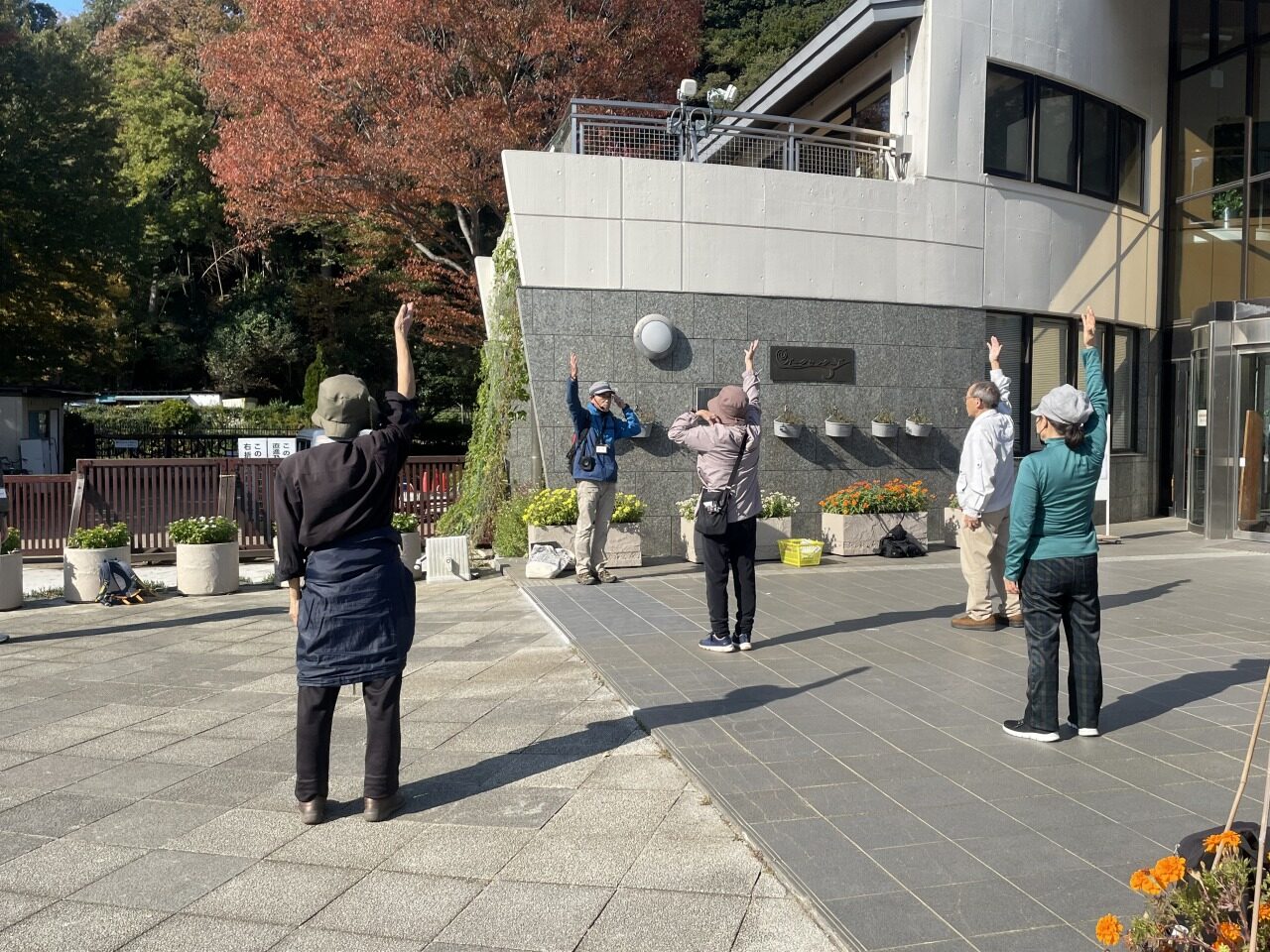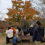 自然界の「ゆらぎ」と私たちの体の「ゆらぎ」の関係性について解説し、ユリノキの大木のエリアで各自に気に入った樹に手で触れたりハグをしてもらい「ゆらぎ」を体感してもらいました。広場の中央で360度の紅葉景観を楽しみ、1分間目をつぶって聴覚に集中する体験をしてもらいました。