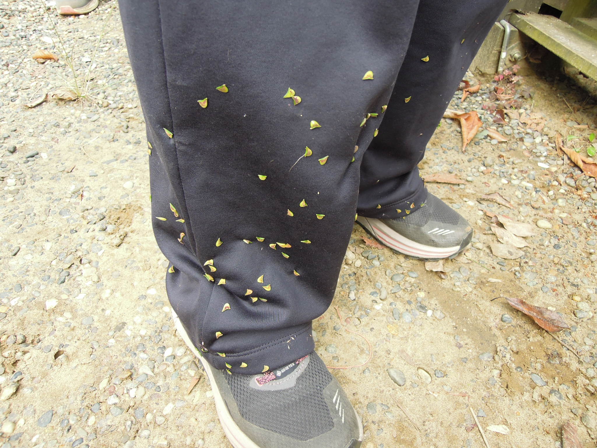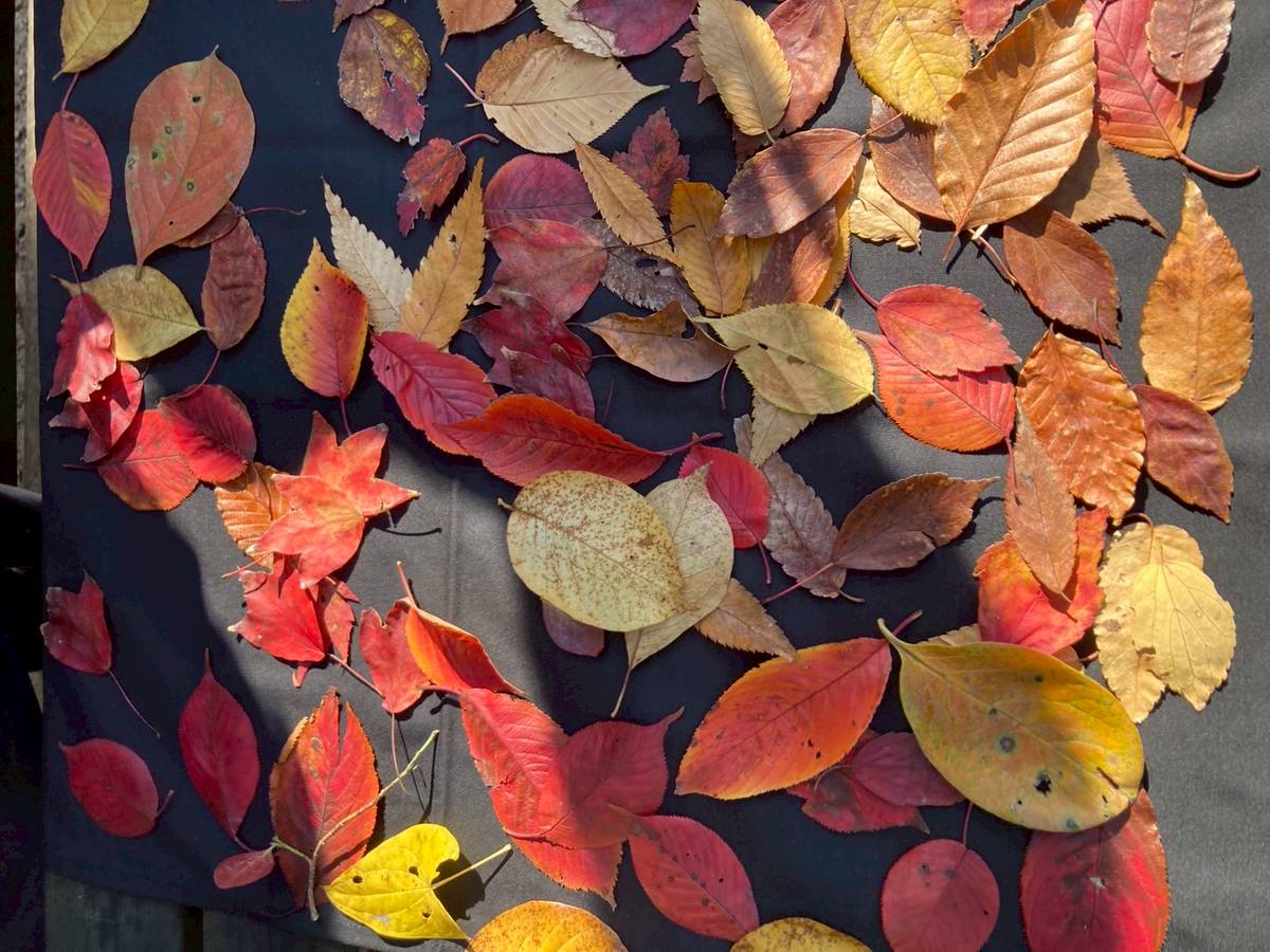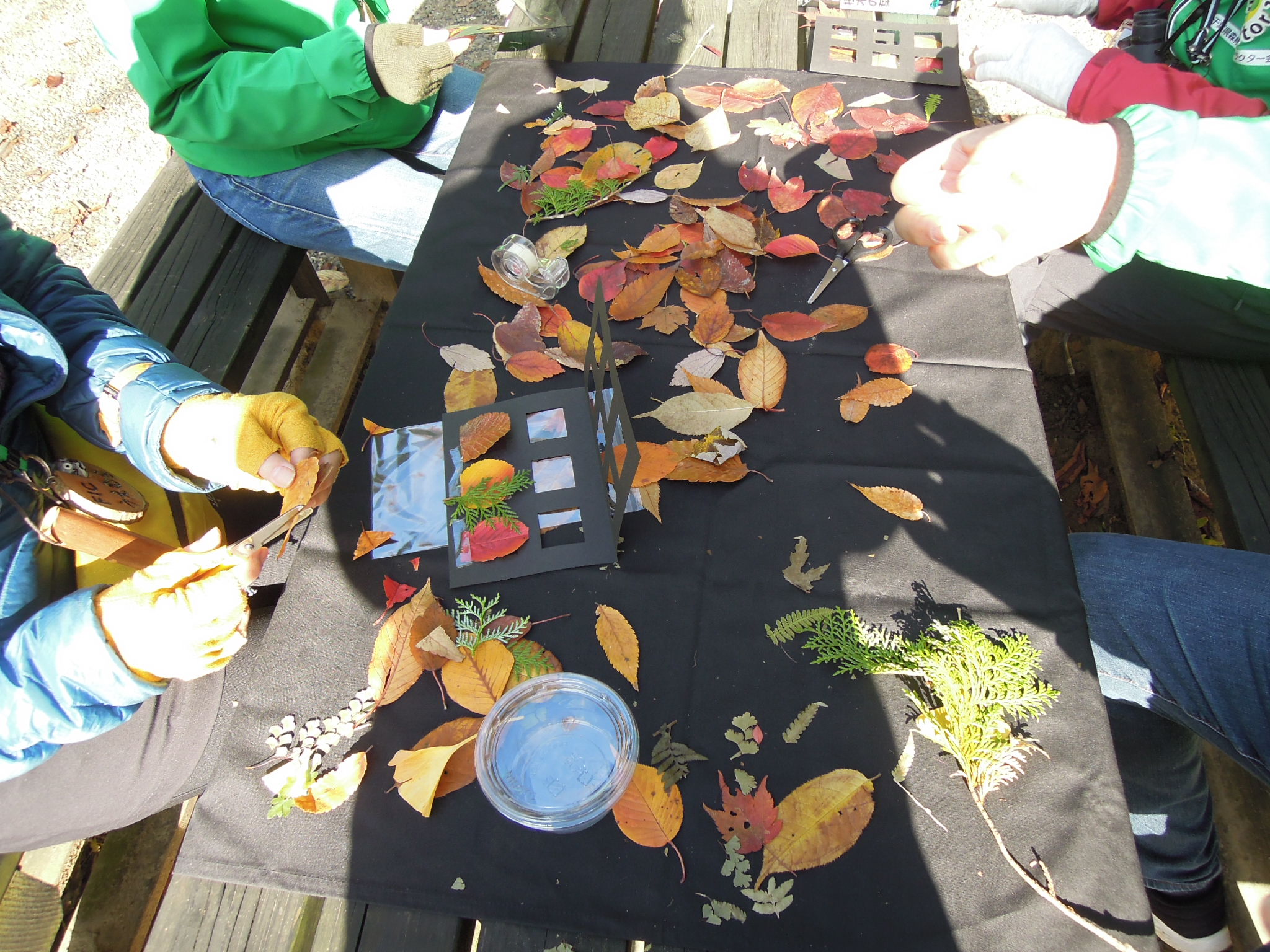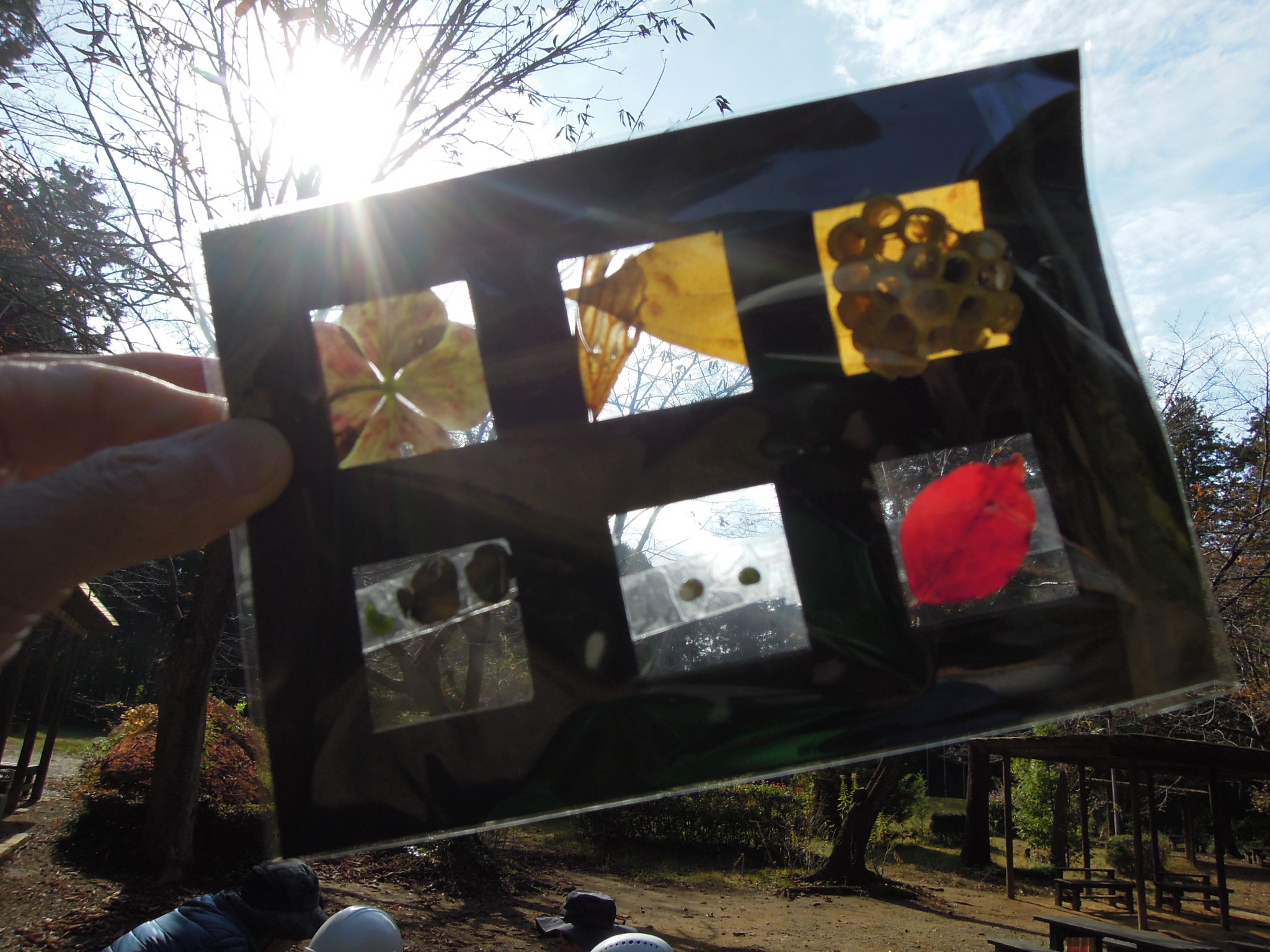 観察の後は葉っぱを使ったステンドグラスの作成です。子どもたちは自由にパパっと素敵な作品を2つも作って、また虫をさがしだします。作品を見るとアシナガバチの巣やセミの翅も貼り付けてあります。大人はじっくり作ります。森の秋のお土産は落ち葉のステンドグラスと服にひっついた種子です。