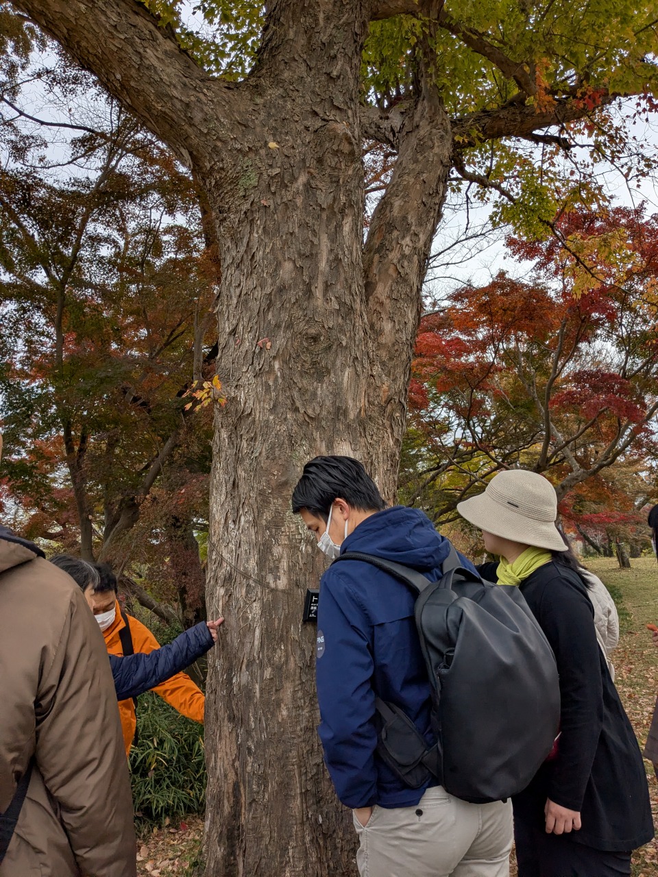 ハーブ畑ではタイム類や珍しい食香バラなどを鑑賞したり匂いを嗅いでいただきました。さくら山に登り、筑波山方面の眺望を楽しんだ後、布施弁天や日本庭園を見下ろせる場所で座って休憩し紅葉を楽しみます。二期咲きのアーコレードの花を鑑賞し、毛で覆われたコブシの冬芽の感触を楽しみます。斜面途中のスギ、ヒノキ林にて葉の匂いを比較し、材の鎮静効果、葉の覚醒効果について説明しました。水生植物園に下り、小川の畔で1分間目をつぶり聴覚に集中して小鳥の囀りや小川のせせらぎの音を聴いてもらいます。その後、前方の音を拡大して聴く方法を解説しました。クスノキの樹の下で深呼吸をやっていただき、森の新鮮な空気をいっぱい吸っていただきました。日本庭園に移り、紅葉を楽しんでいただいた後、茶室「柏泉亭」にてどんぐりストラップのネイチャークラフトを体験いただき、最後はハーブティと特製のお茶菓子「竹炭フィナンシェ」でゆっくりと寛いでいただきました。