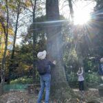 月桂樹の甘い香りを嗅ぎ、湿った地面の苔の感触を楽しみます。丘の上の旧アスレチック広場にてクルミの果実等を観察後、ハンモックと地面にて10分間の森林安息を体験し、気に入った樹木の横に立ち、樹皮に触れるとともにハグしてもらい、自然界の「ゆらぎ」を感じていただきました。