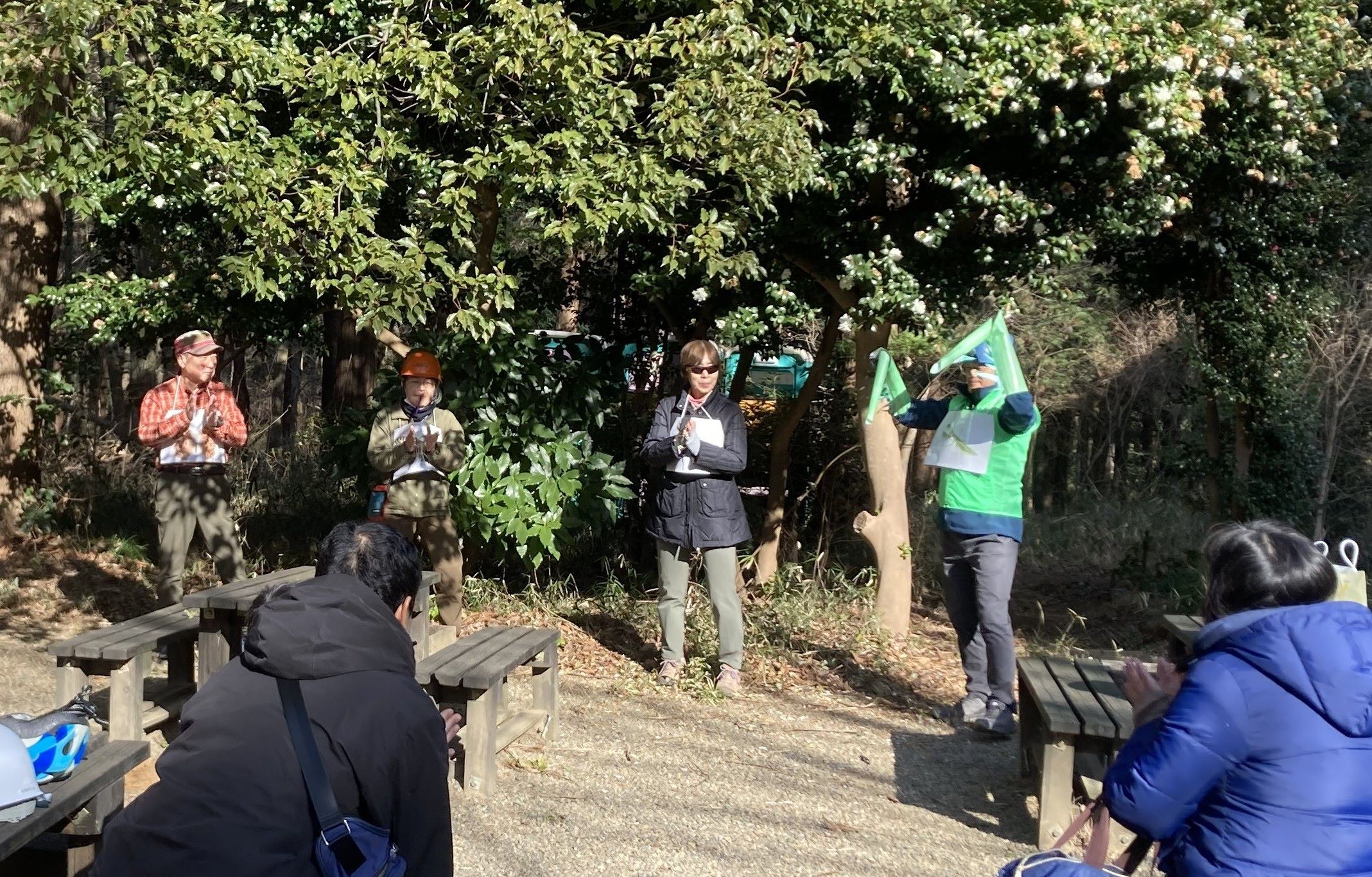日陰はひんやりするも暖かな日差しが注ぐ県民の森の一角で今日のテーマ「生き物の冬越し」講座がクイズと絡めたコントで始まりました。