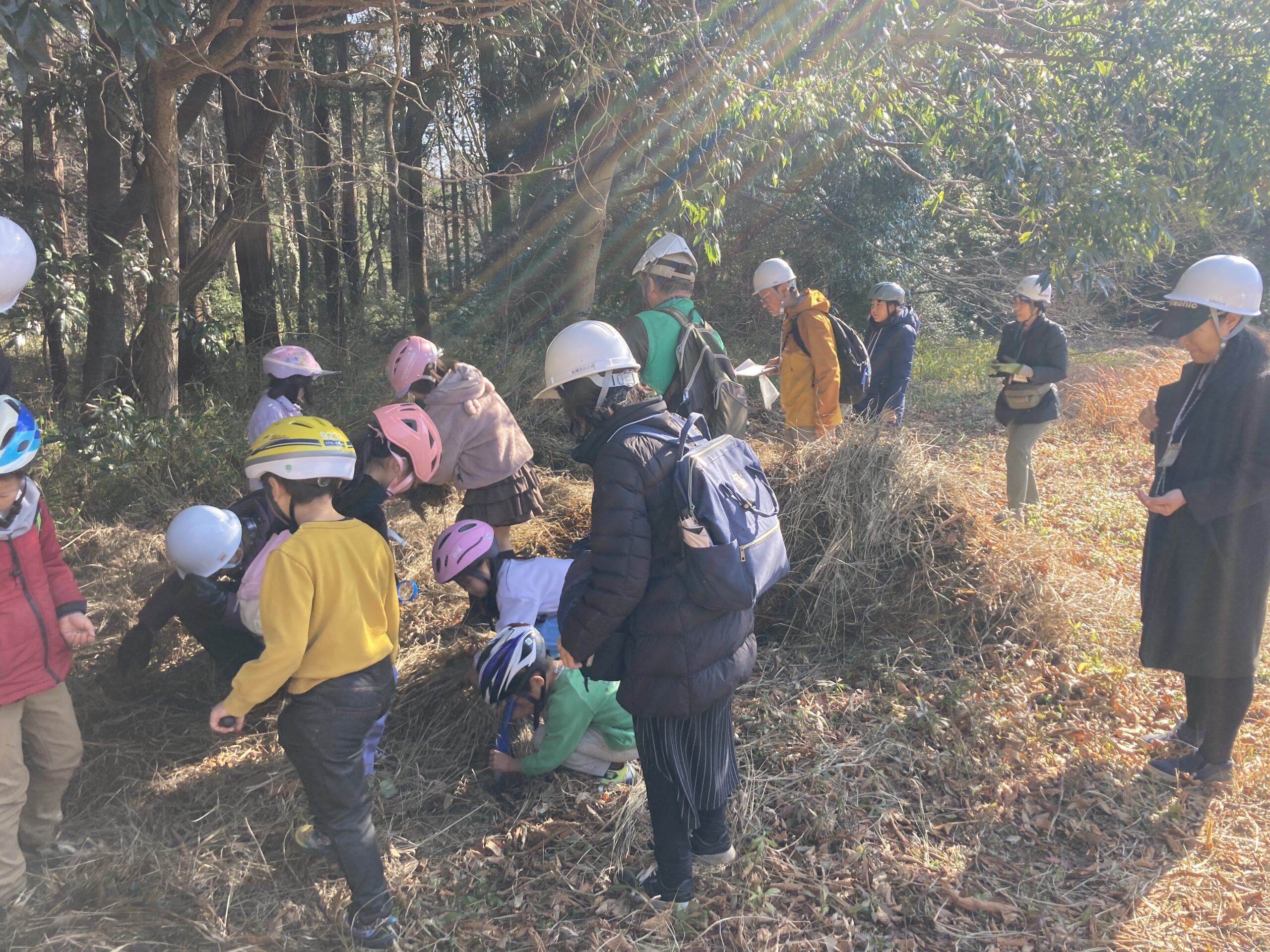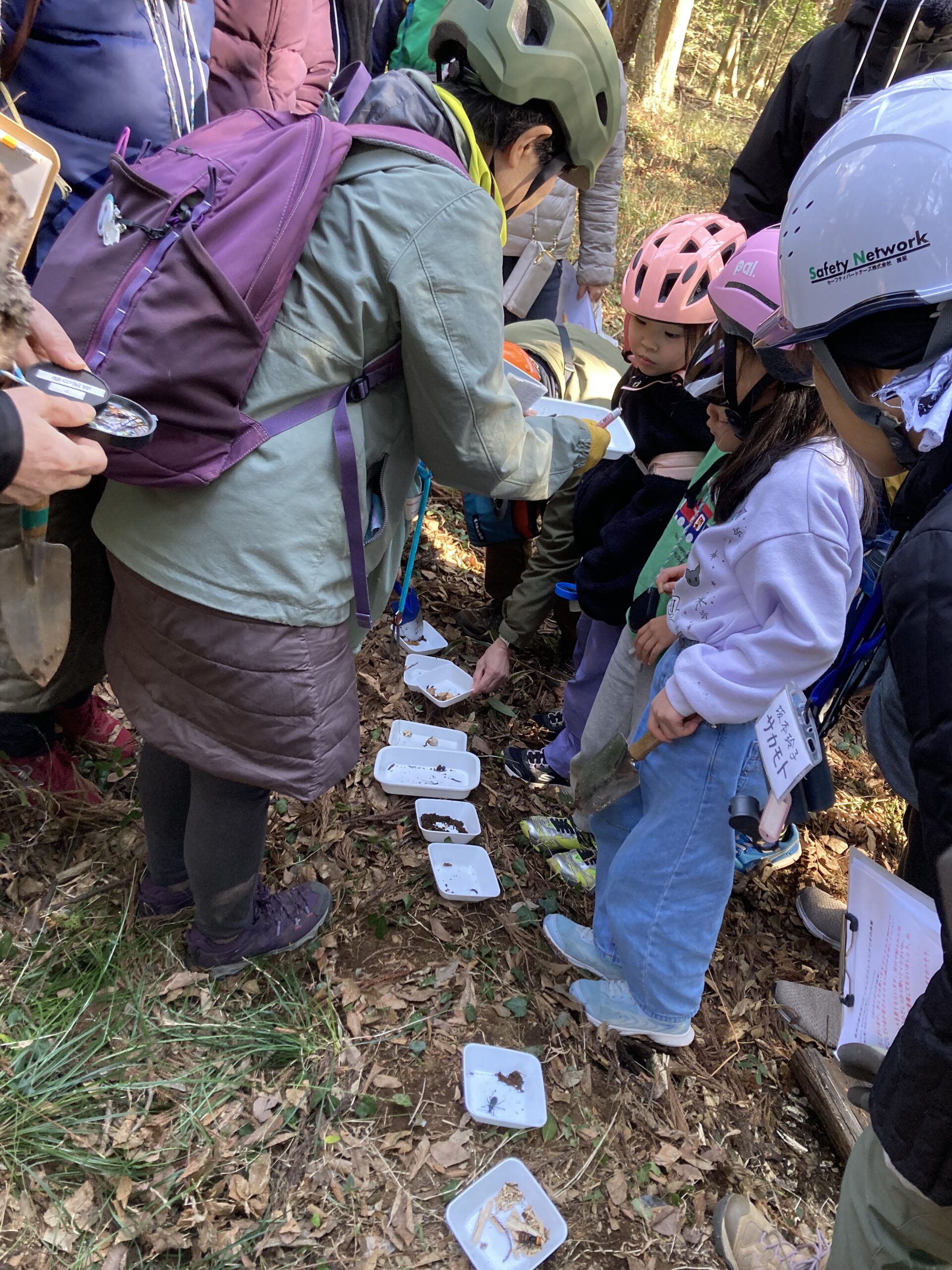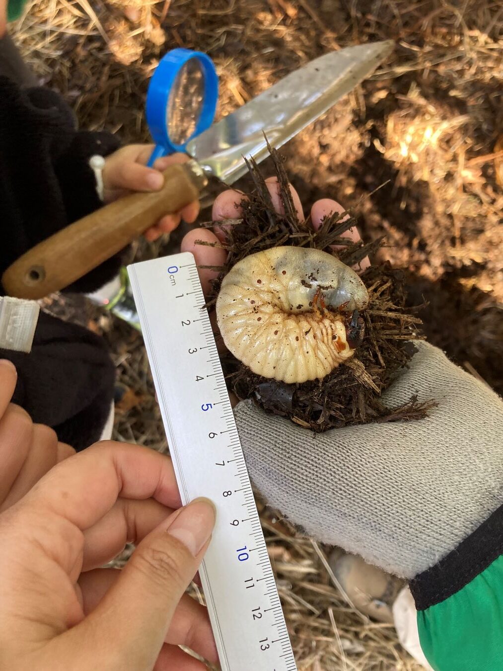 最後に運動広場の隅に集められた腐葉土内にいるカブトムシの幼虫を観察しました。活動時間も残り少なくなり、出てきた幼虫は5匹ほどでしたがどのような状態で冬越ししているかを体験することができ、納得感をもってもらえたと思います。朽木の時と同様、幼虫を土の中に戻し、枯葉も元に戻してその場を離れました。