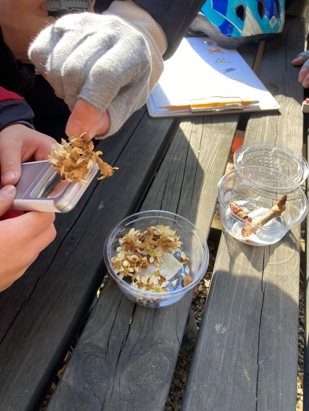 次は植物にも冬越しの工夫が見られることをビワの花のつくりや匂い、またトチノキの冬芽の手ざわりや表面の様子、内部の様子を観察してもらいました。冬越しの特徴がわかってもらえたと思います。