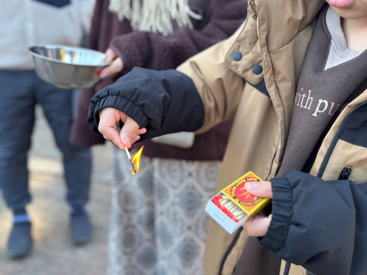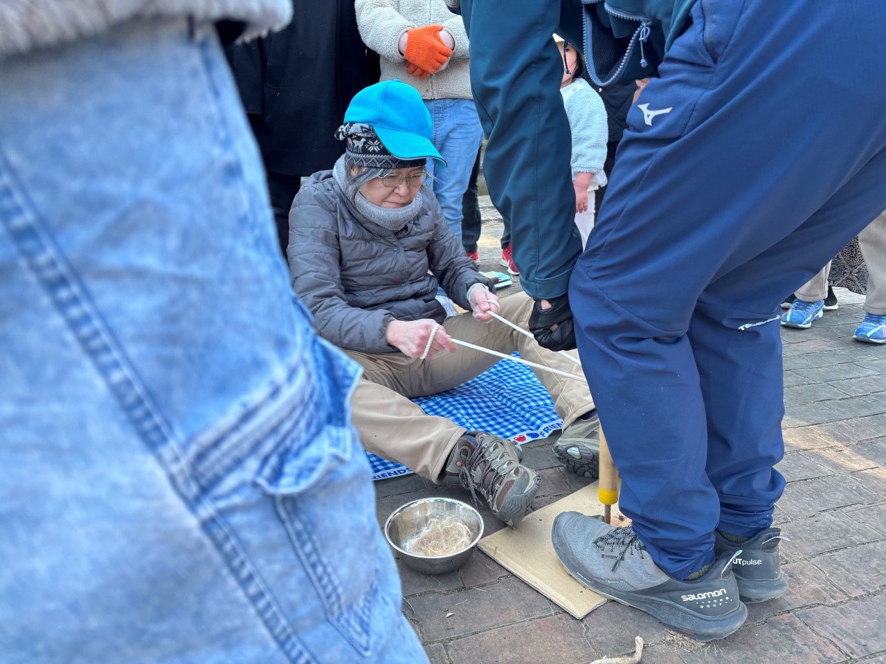 原理と歴史が分かったら、次は体験です。明治時代の「マッチ」、江戸時代の火打ち石の現代版の「ファイヤースターター」、最後は原始に行われていた木の回転摩擦で火をおこす「ひもぎり式」に親子で挑戦します。なかなかうまくいきませんが、「燃焼の3要素」を考えながら工夫をして挑戦します。親子が一丸となって取り組み、火が付いた瞬間の笑顔はとてもいいものでした。