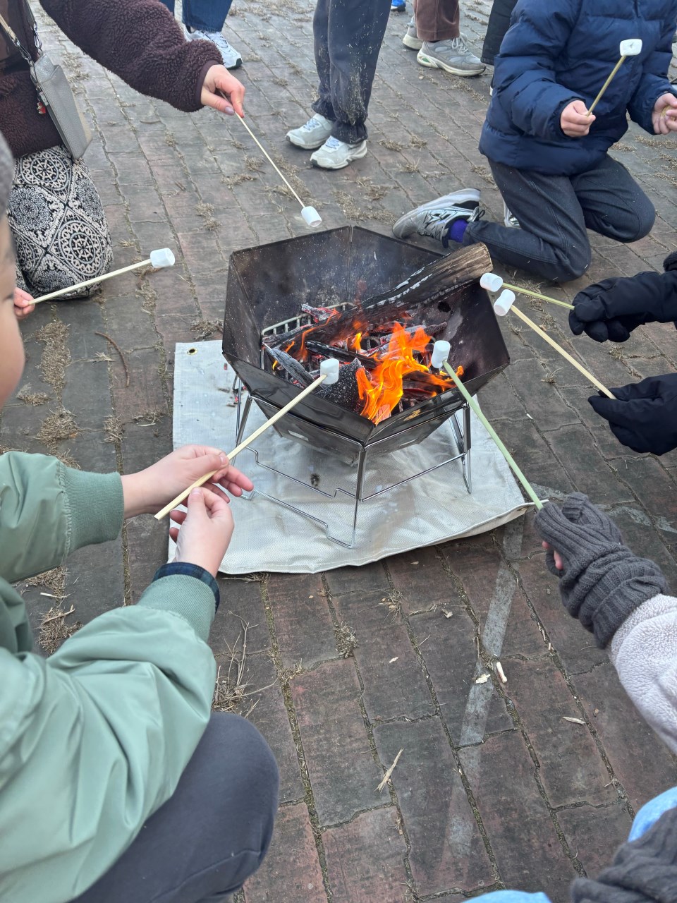 そして、最後は「火の利用」。「火起こし」は、火を利用するのが目的なので、火の講座としては「火の利用」を外すわけにはいけません。今回はキャンプで定番のスモアを作りました。直火で焼いたマシュマロをチョコとクラッカーにサンドして食べた味は、とてもワイルドて美味しかったようです。