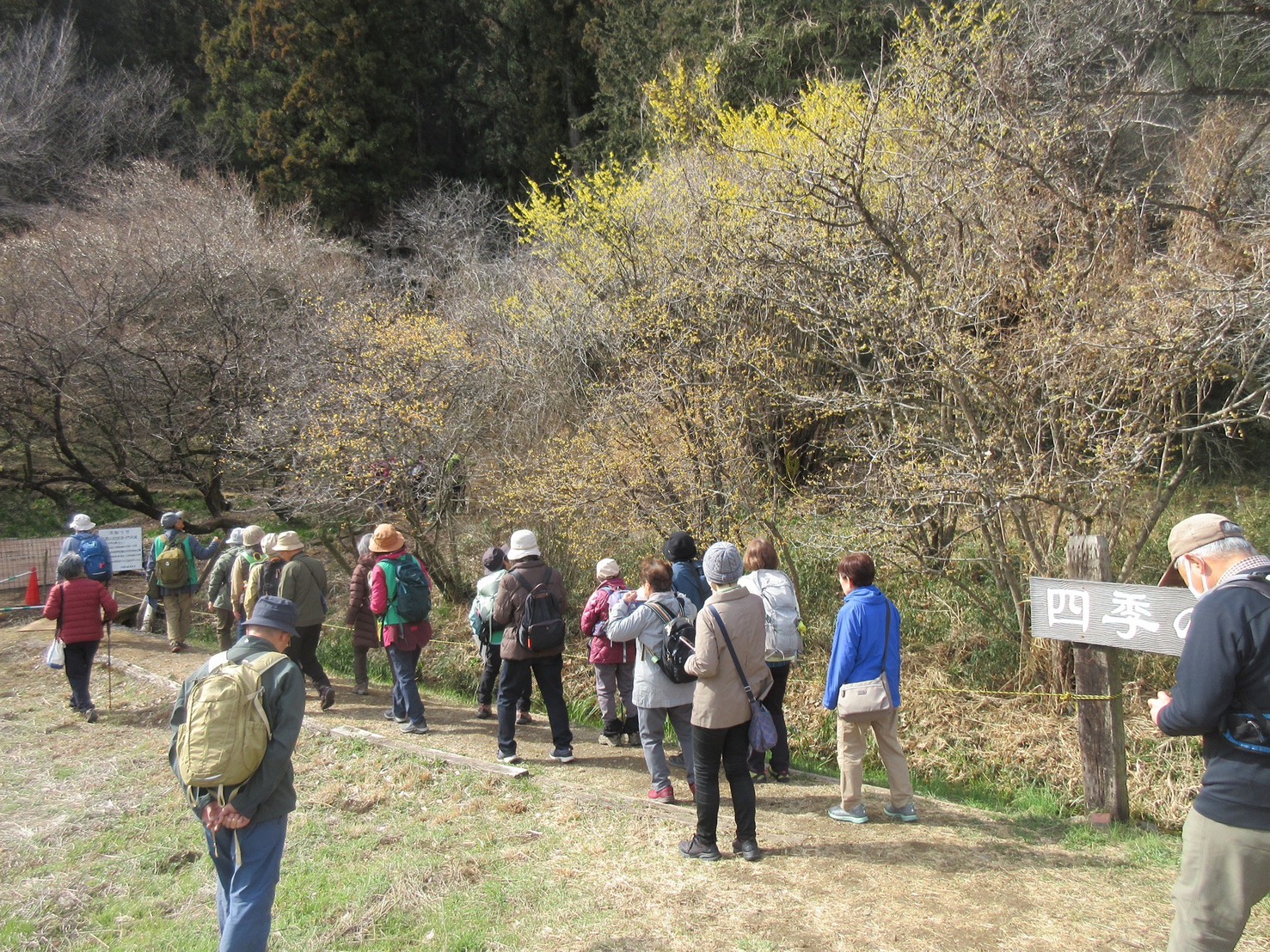 到着した星野は早春の光にあふれ、ウメやマンサク、ロウバイに彩られた静かな山里です。「四季の森星野」ではセツブンソウの大群落と、ここを守っていらっしゃる熊倉さんご夫妻が迎えてくださいました。ゆっくり時間をとって園内を散策し、咲き始めたフクジュソウやアズマイチゲ、アセビやサンシュユ、植栽のキバナセツブンソウなど、いろいろな花を探したり、写真を撮ったりして楽しみました。