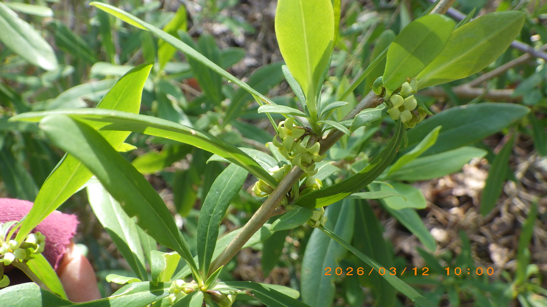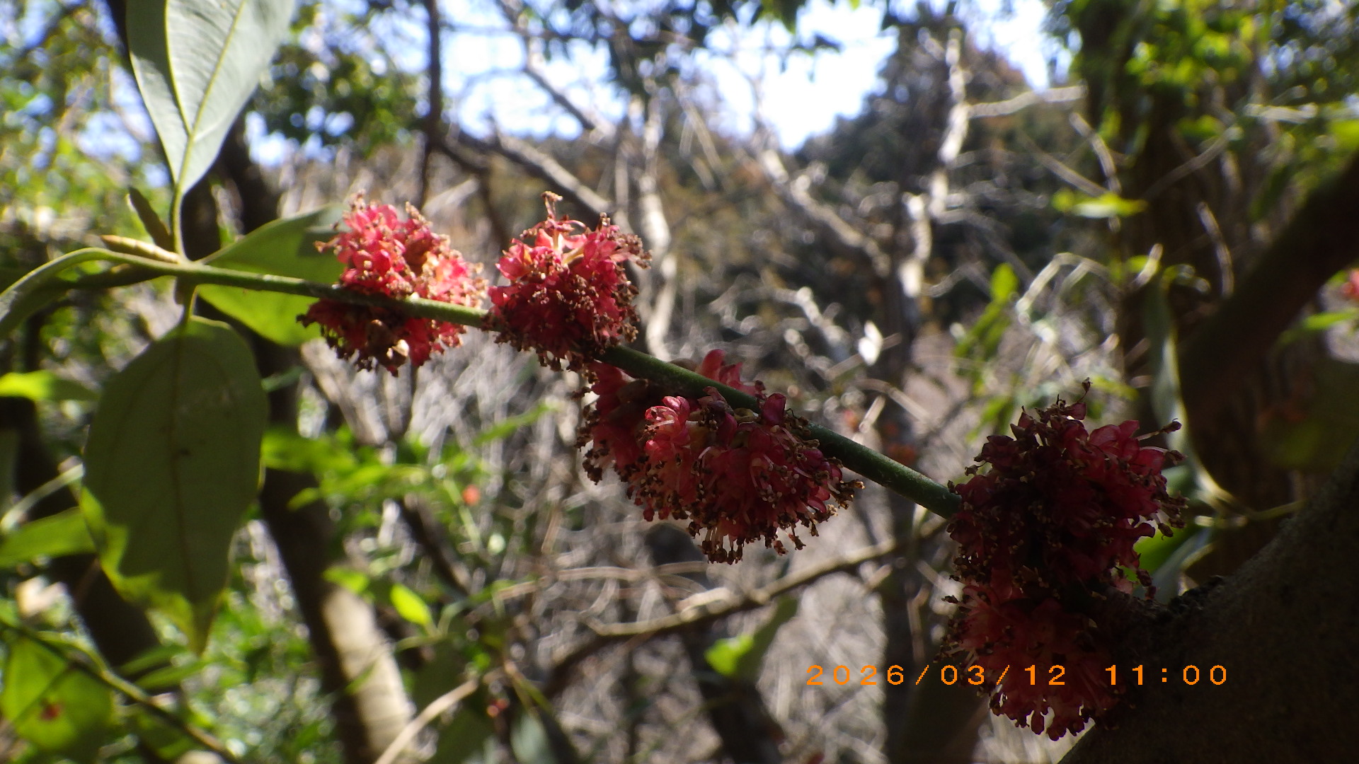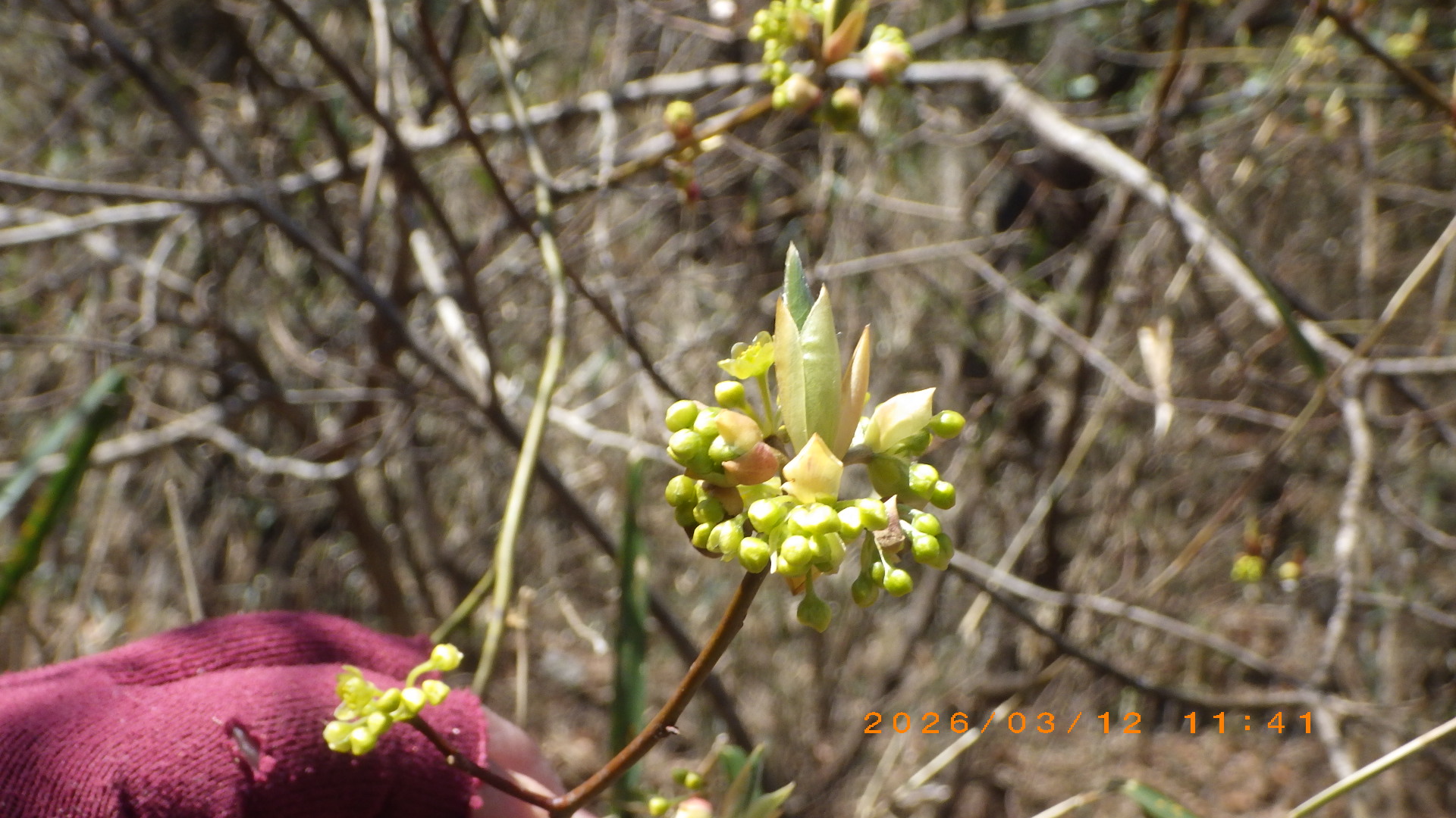 作業後はFICの森内を春を求めて散策を実施。作業道をFICの森看板より反時計回りで君津の森を周回した。オニシバリの黄緑の花・イヌガシの赤い花・クロモジの黄色が目立った。また、10本ほどのアベマキの大木付近の作業道にはドングリの殻斗が多く落ちていて、更に付近にシカの糞が見られた。看板付近で集合写真を撮りFICの森を引き上げた。
