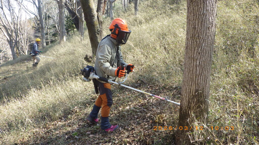 今日の活動は、2名が担当し山頂部近くの作業道に係る1本の倒木をチェーンソー活用し処理を実施。ほか8名で遊々の森倉庫前斜面の除草作業であり、まずは斜面はヤマザクラやケヤキなどの枯れた落枝が多いのでそれを拾い除去した。