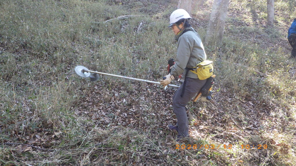 笹等の中にオニシバリ・ツクバトリカブト・ヒガンマムシグサ等の希少種があるので、これを刈り払わないように最善の注意をして刈払い機を使用し処理した。