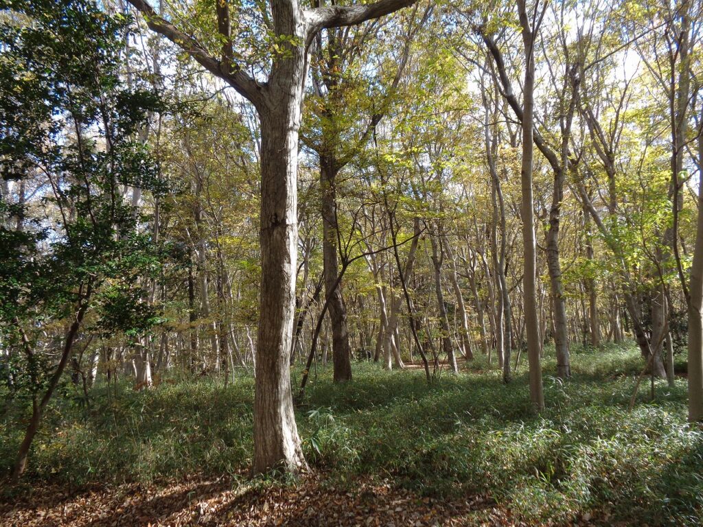 まずは落葉広葉樹が多い森に入りました。ムクノキ、コブシ、ヤマコウバシ、イヌシデ、ウワミズザクラ、イヌザクラなどが次々と現れます。ムクノキやイヌシデは大木が多く、周りで幼木も育っているのが分かります。林床のササは適度に刈り込まれており、自然体験ができる森としてよく管理されているようでした。受講生の皆さんには、葉、樹皮、果実や冬芽などを観て、樹種の見当をつけるという楽しさを味わっていただけたと思います。