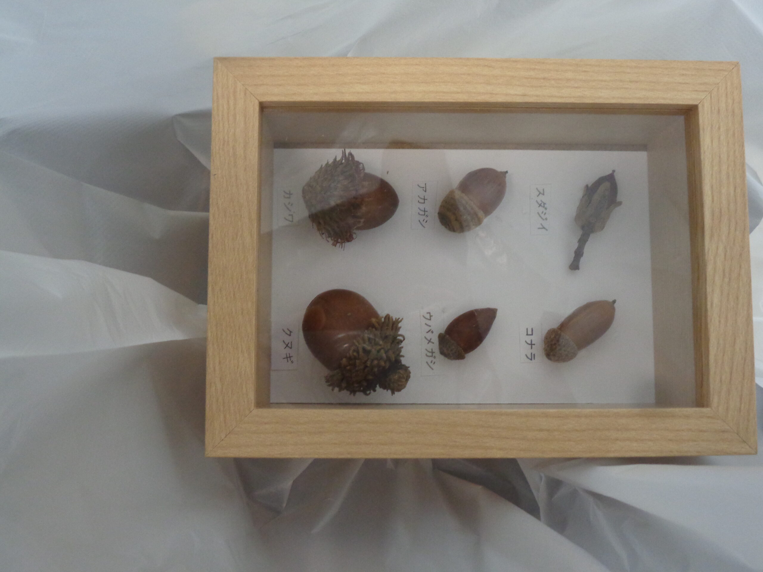 縄文人が食していた「どんぐり」にちなんで関東地方で主にみられるどんぐり9種(アカガシ、アラカシ、シラカシ、ウバメガシ、コナラ、カシワ、クヌギ、マテバシイ、スダジイ)を材料にオリジナルの標本箱を作製しました。参加者の皆さんは、縄文時代の植物にも思いを馳せながら思い思いに作品を完成させました。